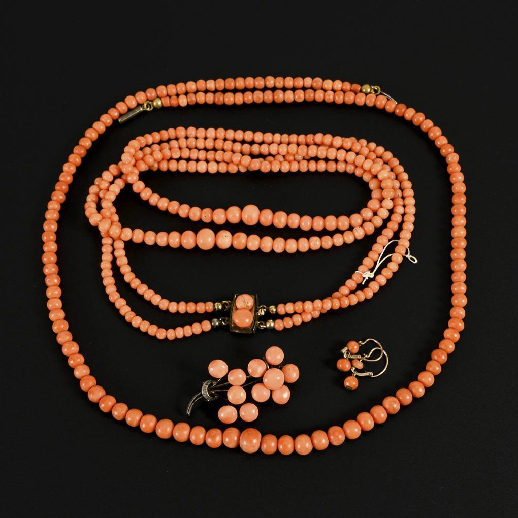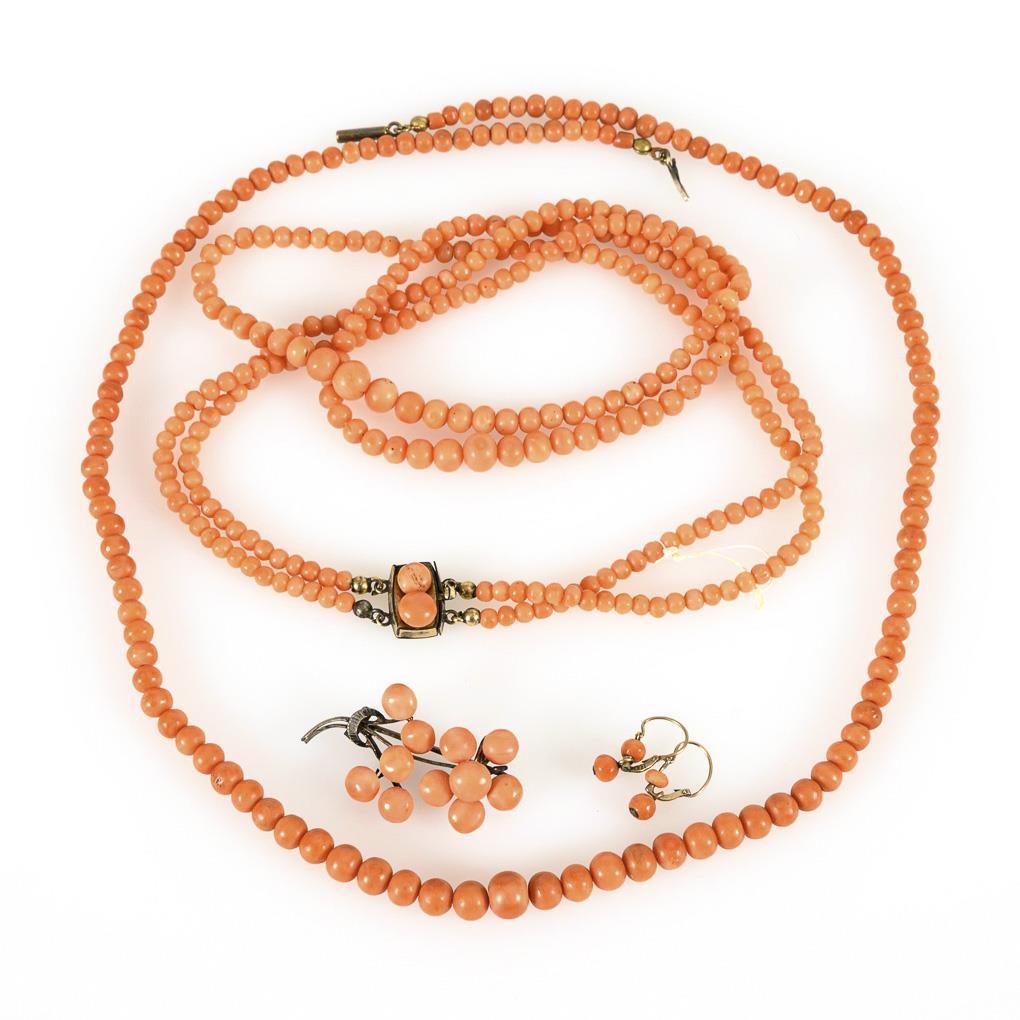 Schnürkette mit Korallenkugeln im Verlauf. 2-reihige Korallenkette an Kastenschloss. Brosche mit Korallenlinsen und kleines Ohrhängerpaar. Metallverschlüsse.