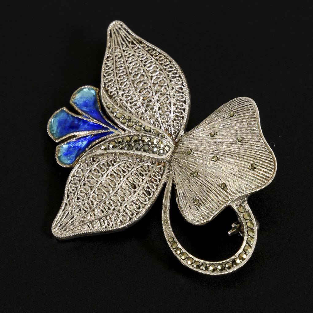 Blütenbrosche mit Filigran- und Millegriffeszier, Markasitbesatz und Email.