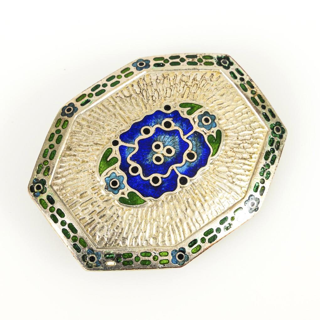 Reliefierte Brosche mit farbigem Zellenemail. Hakenverschluss. kleine Emailfehlstellen am Rand.