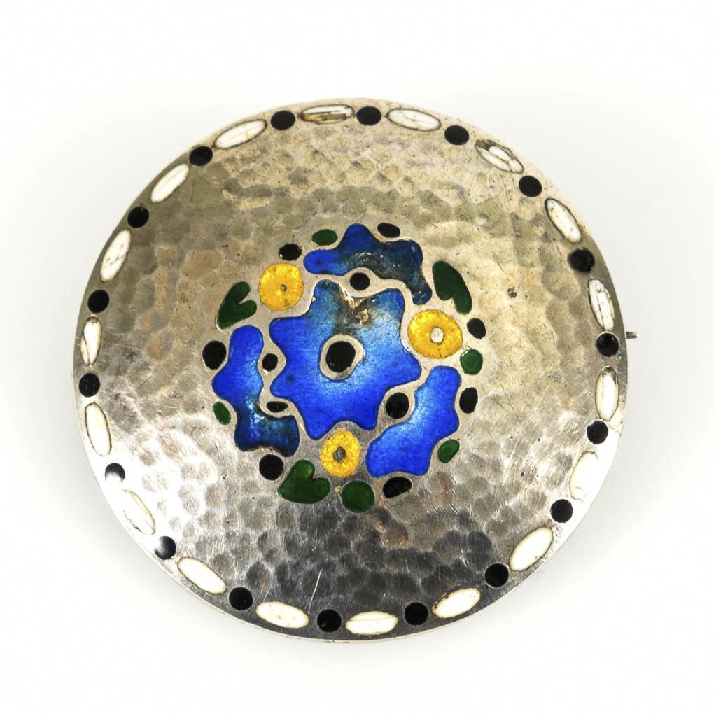 Brosche mit leichtem Hammerschlag und farbigem Zellenemail. Hakenverschluss. Partielle Emaildefekte am Rand und Mitte.