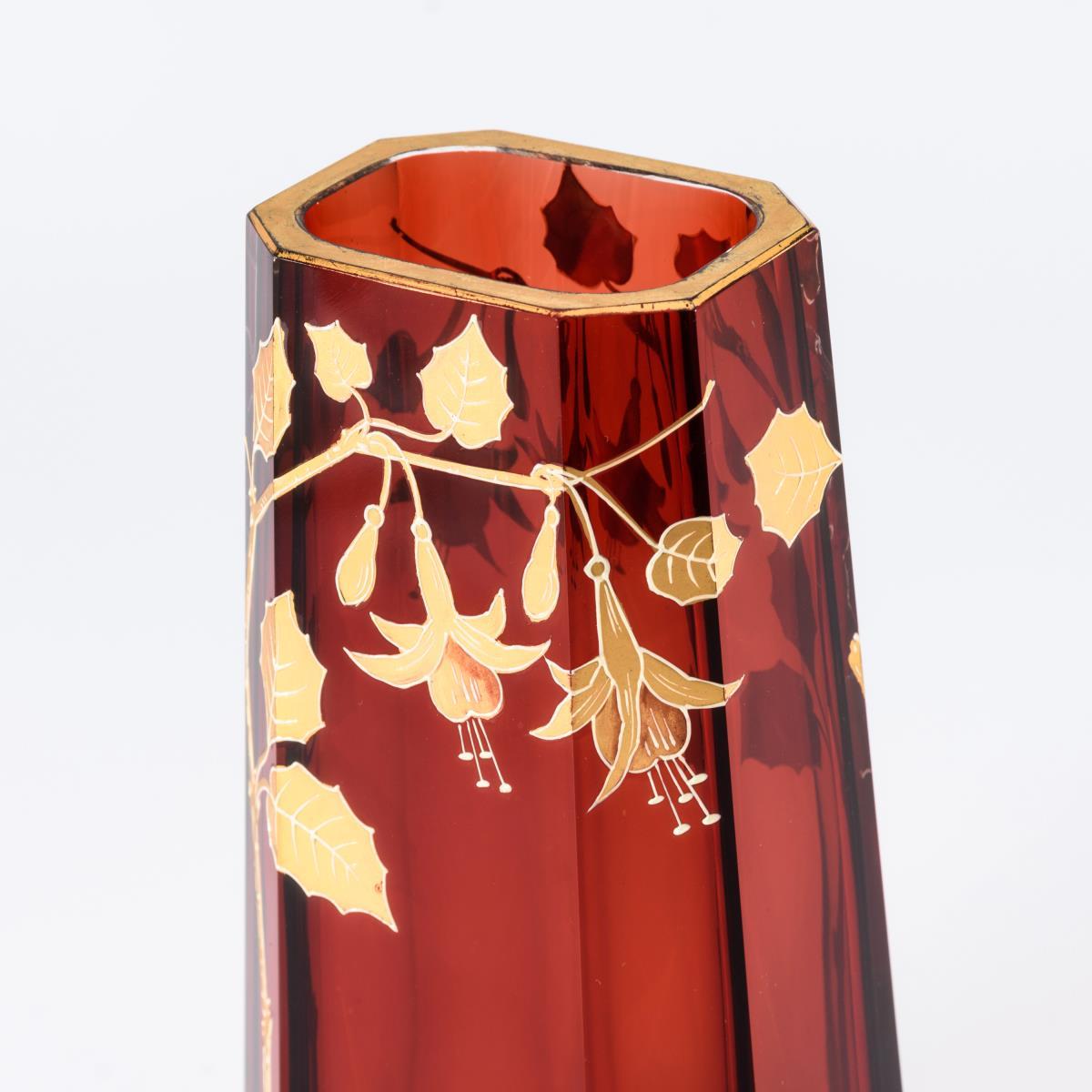 Farbloses Glas mit transparentrotem Innenfang, beige konturierte Goldmalerei. H 21 cm.