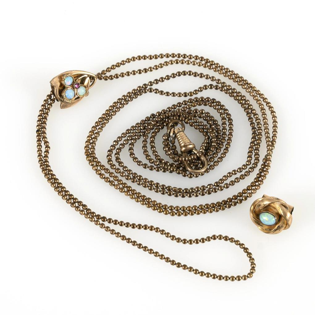 Lange Kugelkette mit Karabiner. 2 Schieber mit kleinen Opalcabochons.
