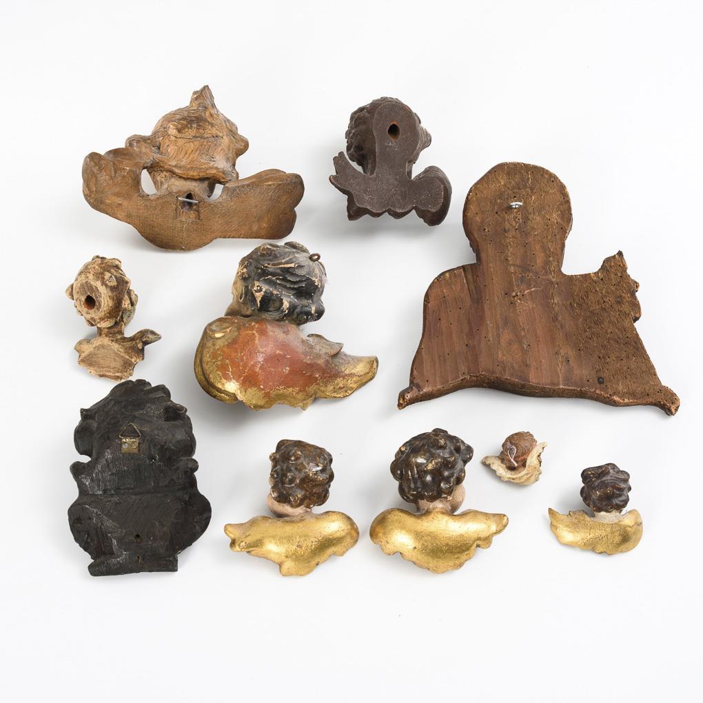 7x Holz (4x polychrom gefasst und vergoldet/goldbronziert, 2x holzfarben, 1x geschwärzt), 2x Kunststoffmasse (braun bzw. beige gefasst), 1x Papiermaché polychrom gefasst. 18.-20. Jh. Maximal 24 x 24 x 5.