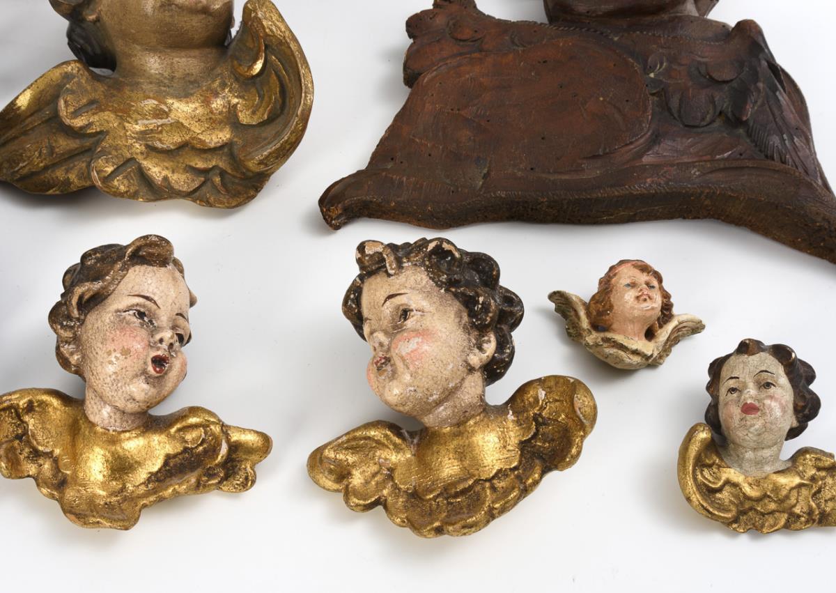Verschiedene Engelsflüchte; darunter 1 als Relief gearbeitet. 1x Anobienspuren und kleiner Ausbruch am Rand, Zumeist Alters-/Gebrauchsspuren.