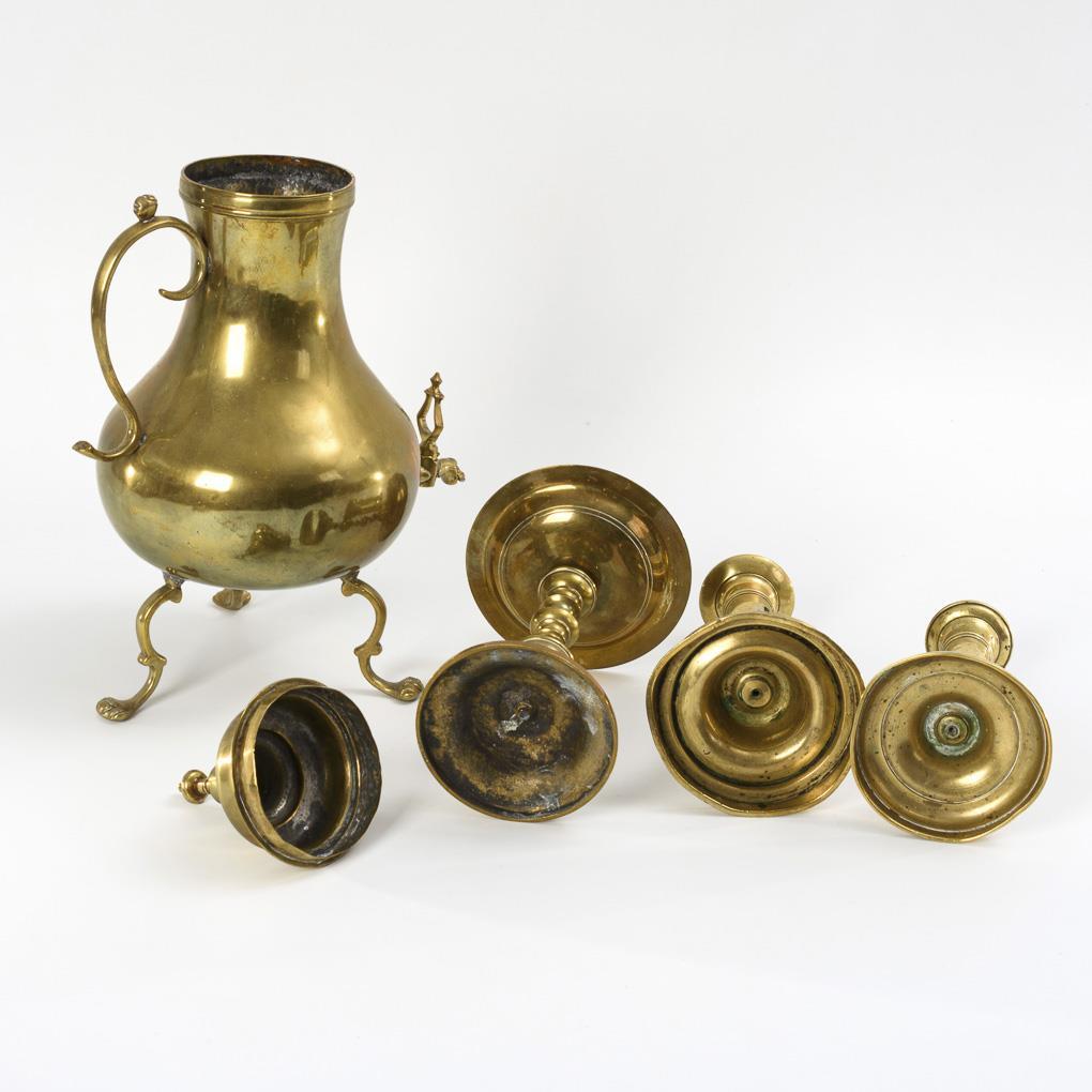 Messing, Bronze. H Kanne 37 cm, H Leuchter maximal 22,5 cm.
