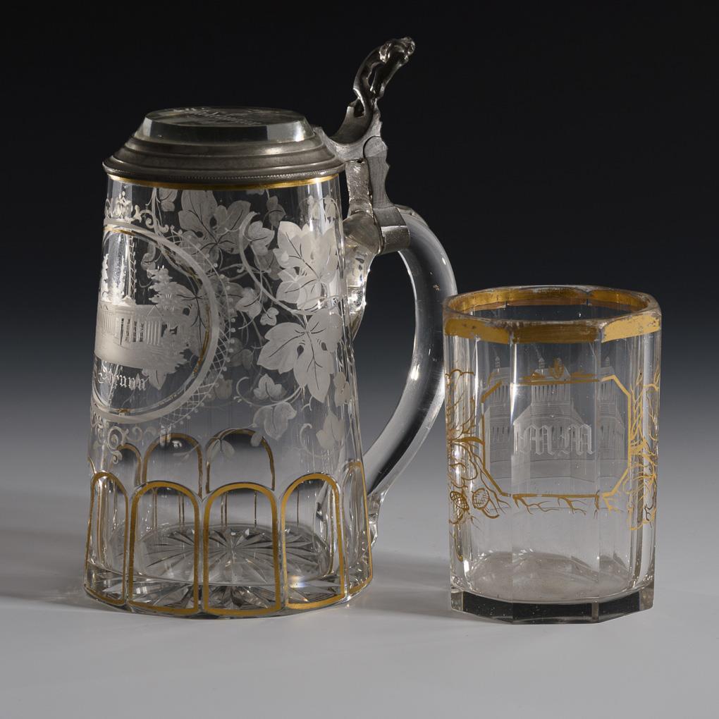 1x konischer, am Ansatz facettierter Bierkrug mit Bandhenkel und zinnmontiertem Scharnierdeckel; Bodenstern. Schauseitig eine gravierte Ansicht von Salzbrunn, flankiert von Hopfenranken, auf dem Glaseinsatz im Deckel der gravierte Name "F. Stadelmann." (H 18,5 cm). / Achtfach facettierter Zylinderbecher mit der schauseitig gravierten Ansicht eines Badegebäudes in Teplitz (H 10 cm). Gold berieben, minimale Bestoßungen am Fuß des Bechers.