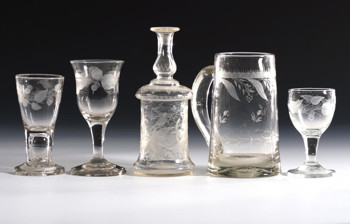 Konischer Bierkrug mit Bandhenkel und Floralgravur (H 15,5 cm). / Karaffe mit dem umlaufend gravierten Dekor von zwei Putten und einem Vogel in Blattranken (ohne Stopfen; H 18 cm). / 3 verschiedene Kelchgläser mit Floralgravur (H 10,5-14 cm).