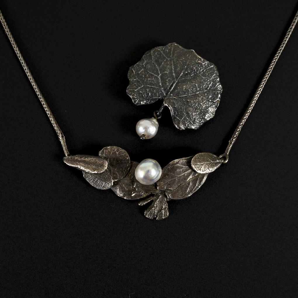 Floral gestaltetes Schauteil mit Zuchtperlen zwischen kurzer Panzerkette mit Ringfederschließe. Blattbrosche/Anhänger mit abgehängter Zuchtperle. Kugelhaken, starre Östen.