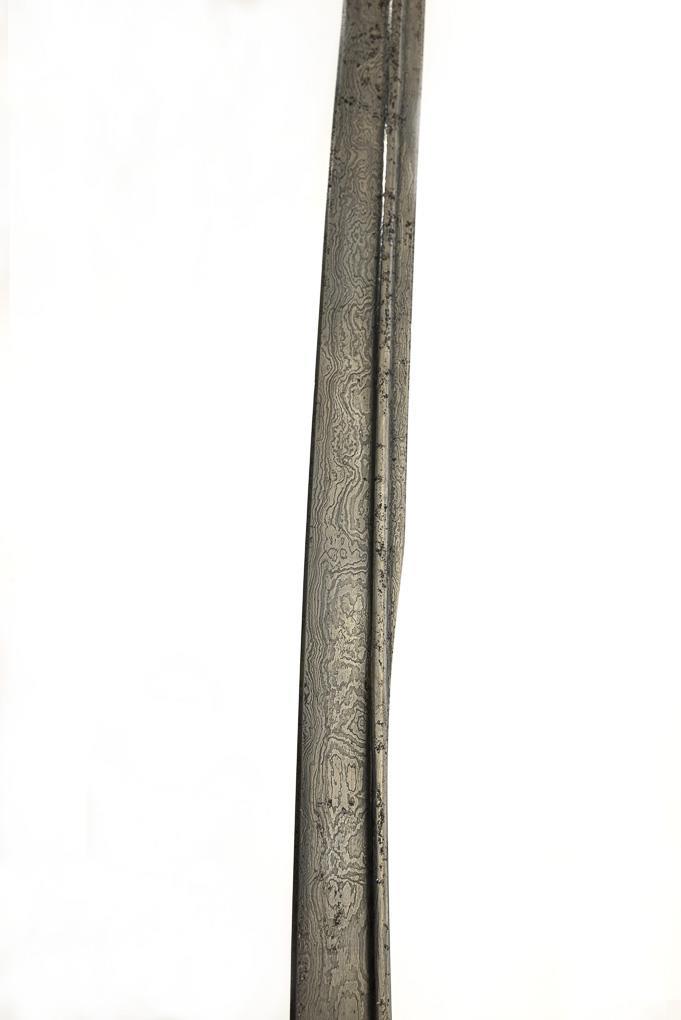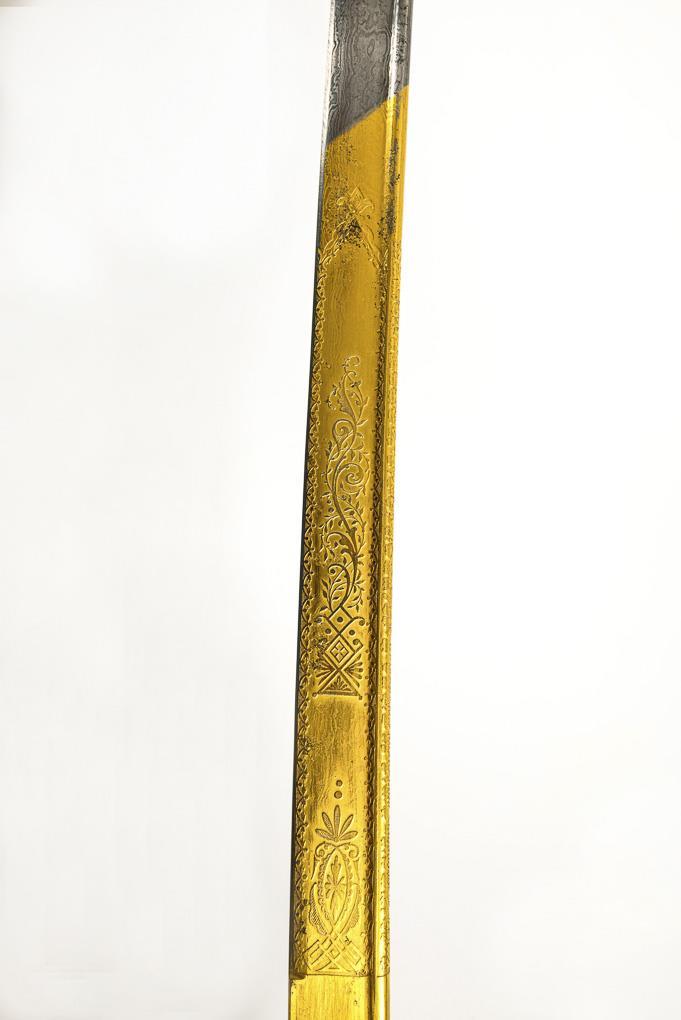 Einschneidige, leicht gebogene Klinge mit langem Schör. Klinge aus Damaszenerstahl mit schöner Oberflächenmusterung, ein Drittel flach reliefiert und vergoldet. Halbovale Stichlappen mit gekreuzten Kanonen und leerem Wappenschild. Rochenhautgriff mit Drahtwicklung und Löwenkopfknauf. Metallscheide mit zwei Ringbändern und beweglichen Ringen. Scheide mit stärkeren Dellen.