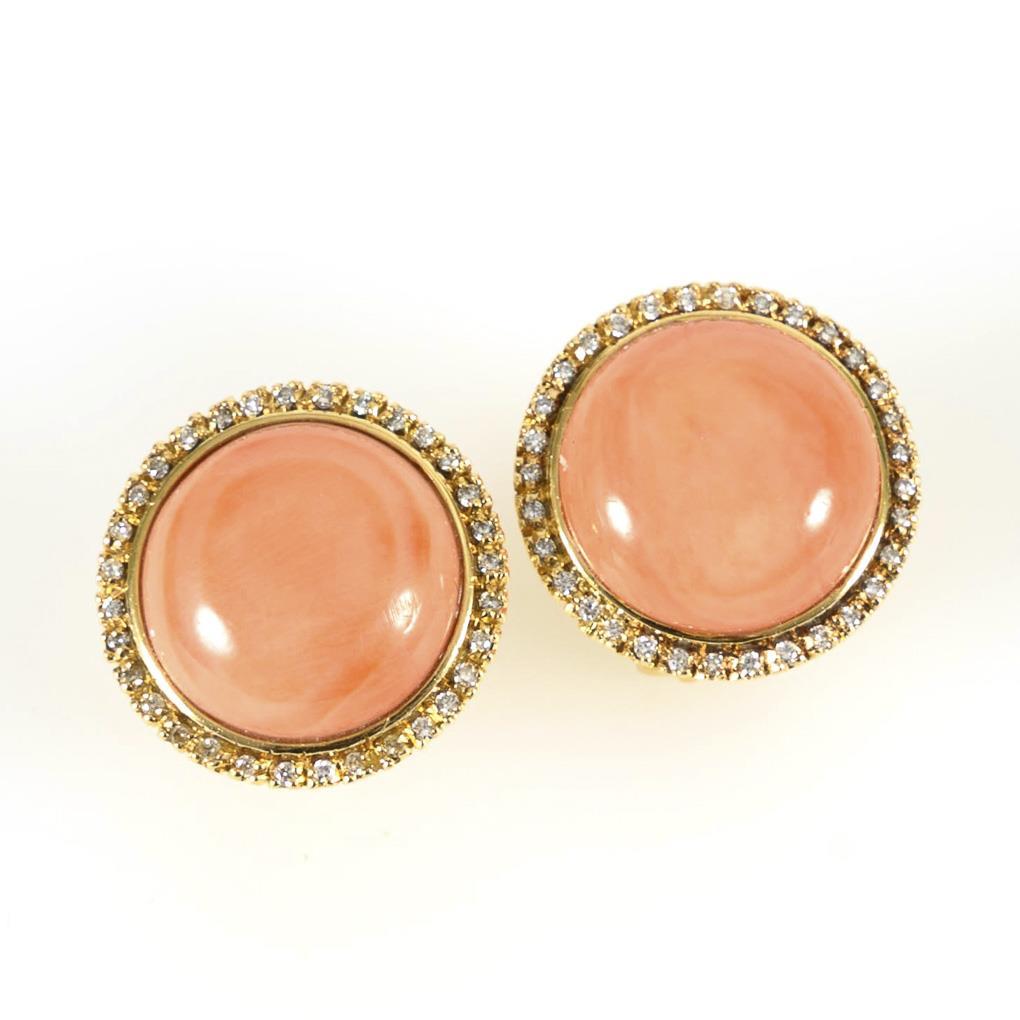 Gelbgold 750 geprüft. Brillanten zus. ca. 0,32 ct. Koralle Ø 14 mm. Ohrstecker Ø 1,8 cm. 13,3 g.