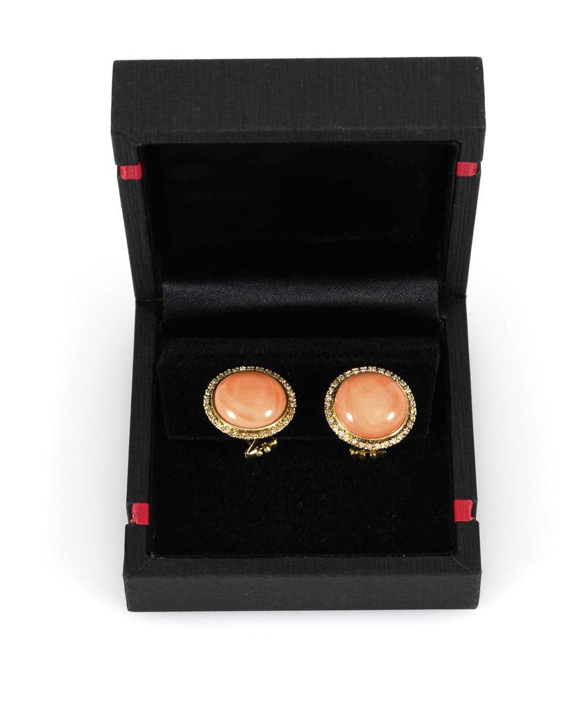 Scheibenbrisur mit zargengefasster Korallenlinse, umgeben von je 32 kleinen, eingelassenen Brillanten. Klipp/Steckmechanik. In schwarz/rotem Etui. Passend zu Ring Kat.-Nr. 327.