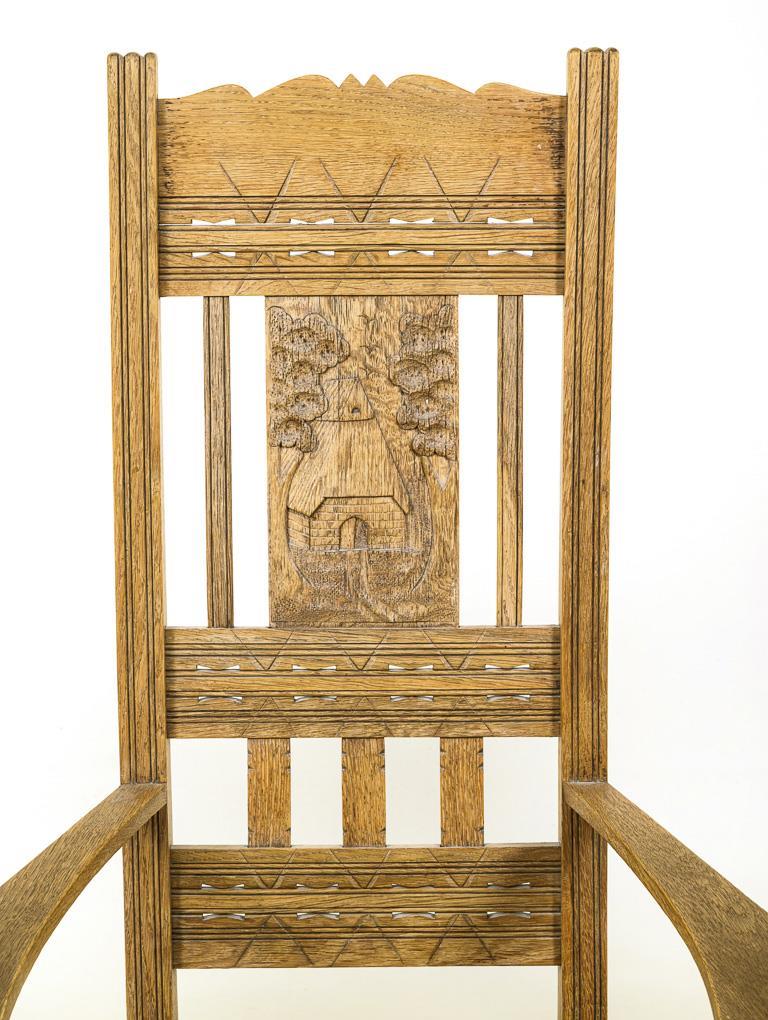 2 Lehnstühle und 1 Armlehnstuhl mit trapezförmiger Sitzfläche aus Binsengeflecht und reliefverzierter Rückenlehne mit verschiedenen Mustern: Lehnstuhl mit reliefiertem Profil einer Dame, H ca. 111 cm, Sitzhöhe ca. 48 cm, Alters-/Gebrauchsspuren | Lehnstuhl mit Initialen "AA" und Jahreszahl "1839", rückseitig Brandstempel, H ca. 107,5 cm, Sitzhöhe ca. 47 cm, Alters-/Gebrauchsspuren, wackelig | Armlehnstuhl mit reliefiertem Bauernhaus, H ca. 129,5 cm, Sitzhöhe ca. 48 cm, Alters-/Gebrauchsspuren, wackelig.