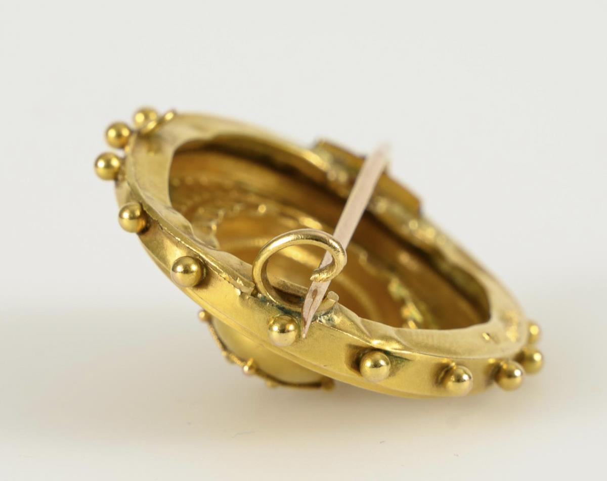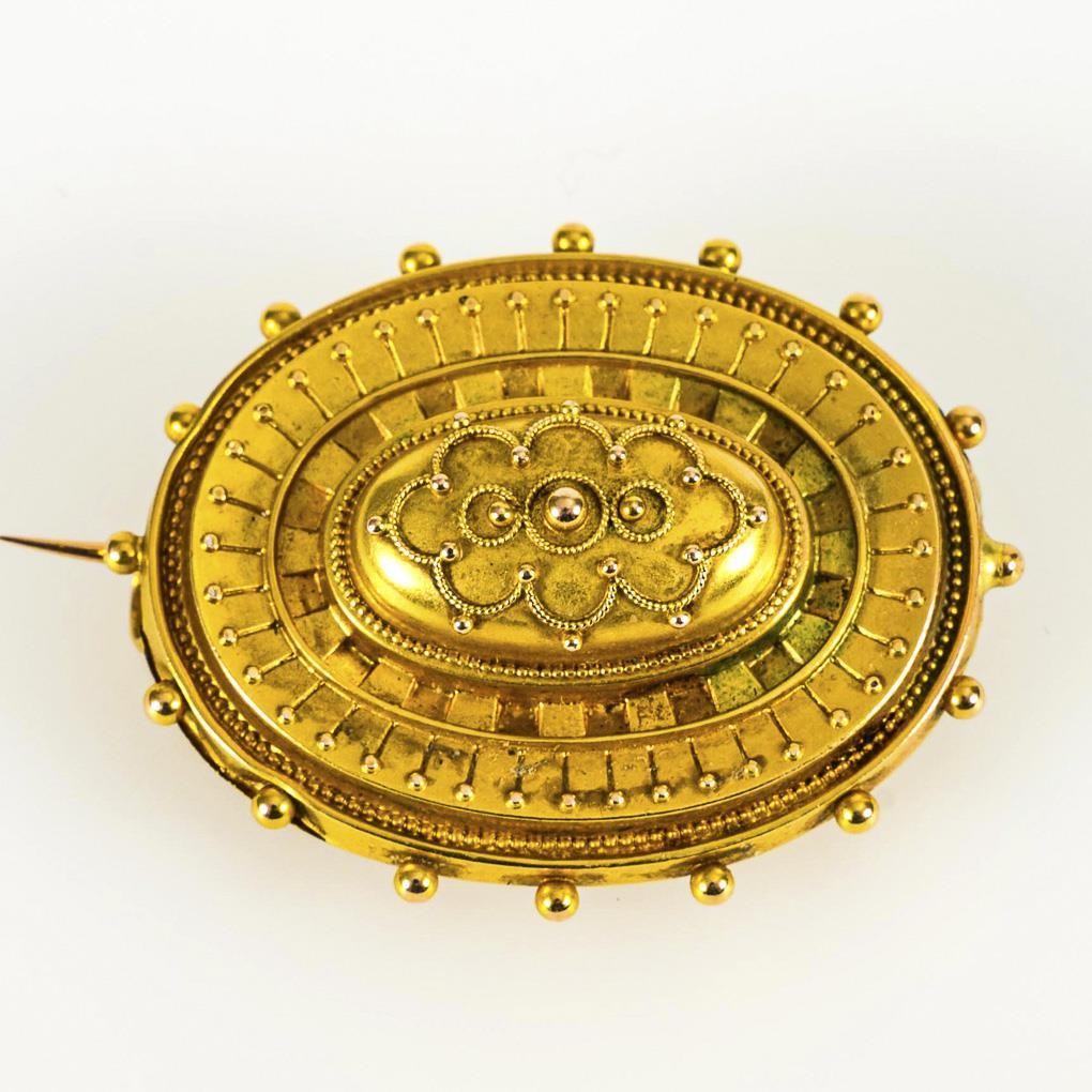 Feine Ornamentbrosche mit Granalienzier. Hakenverschluss. Rückseitig am Rand vereinzelt Druckstellen und Riss, Broschierung restauriert.