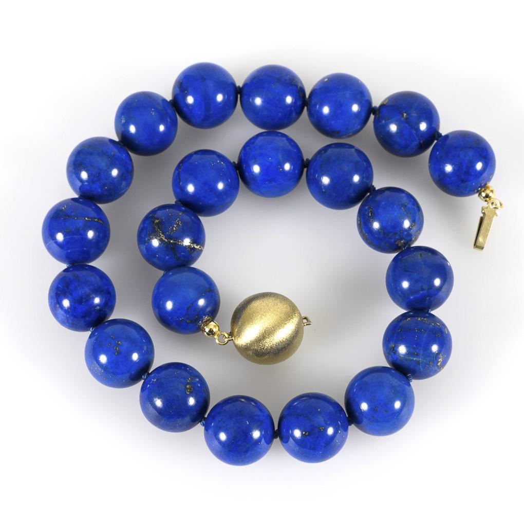 Schließe Gelbgold 585 gestempelt. Punze JKa. Lapiskugeln Ø 1,6 cm. Schließe Ø 1,7 cm. L 40 cm. 140,9 g.