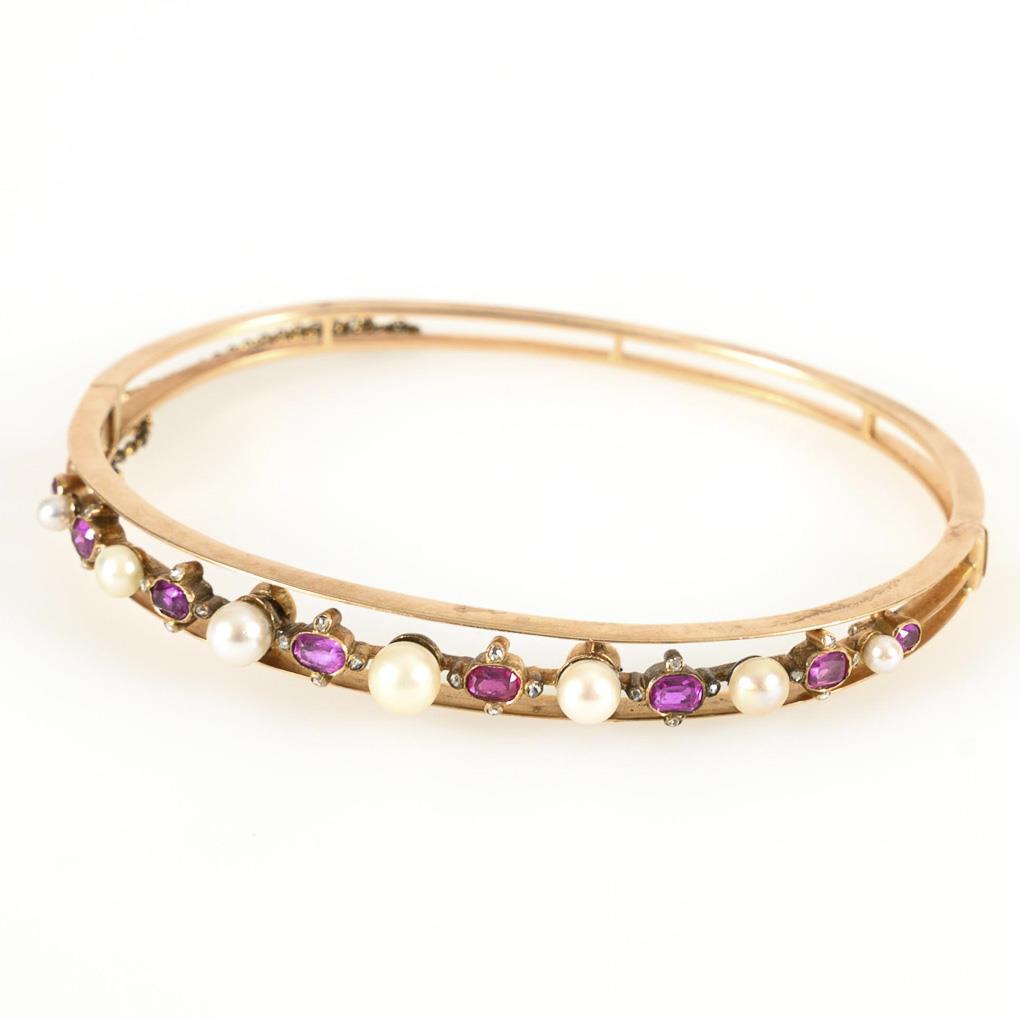 Armreif mit Rubinen, Zuchtperlen und Diamantenrosen.
