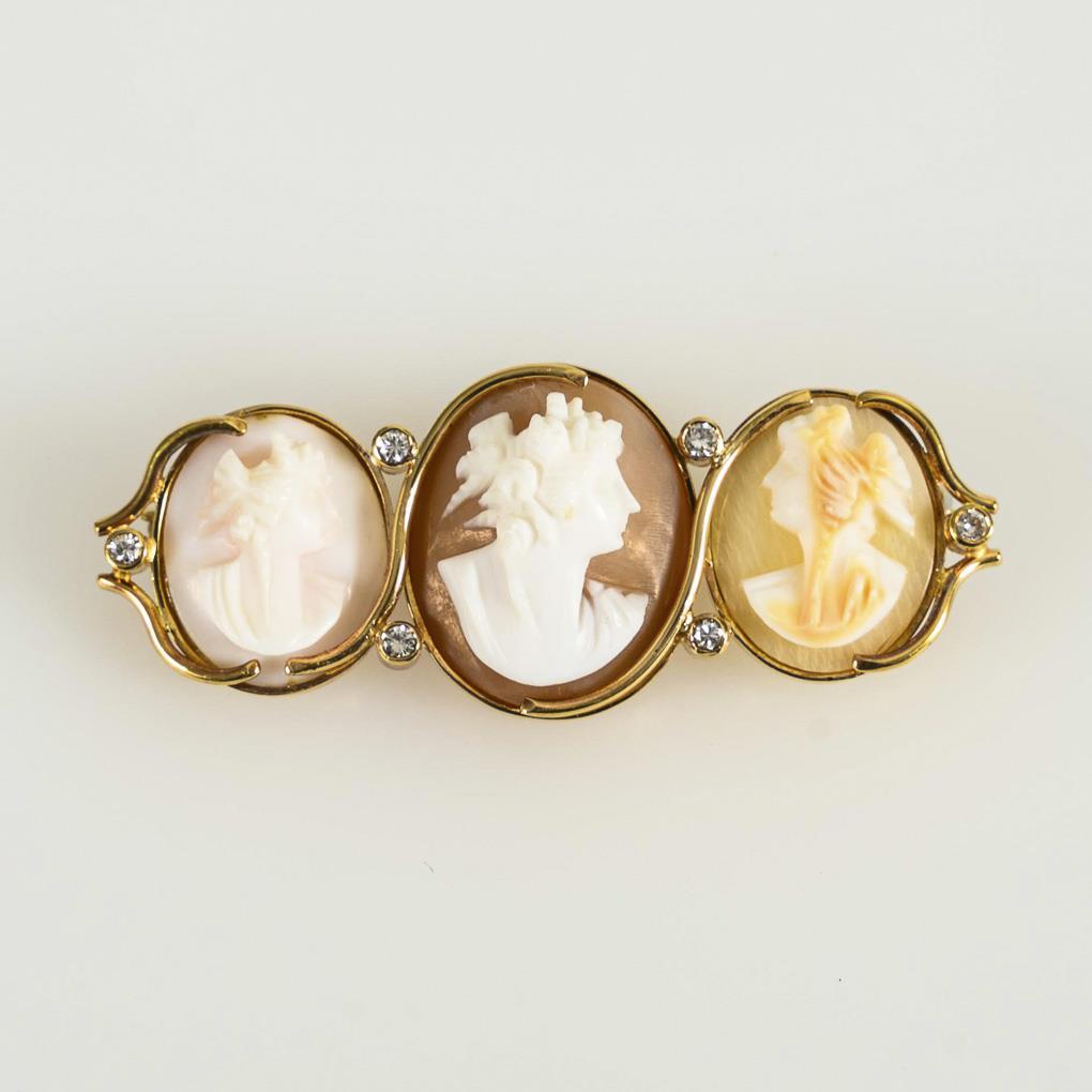 Brosche mit 3 zargengefassten Kameen mit geschnittenen Frauenprofilköpfen und 6 kleinen Brillanten. Kugelhaken.