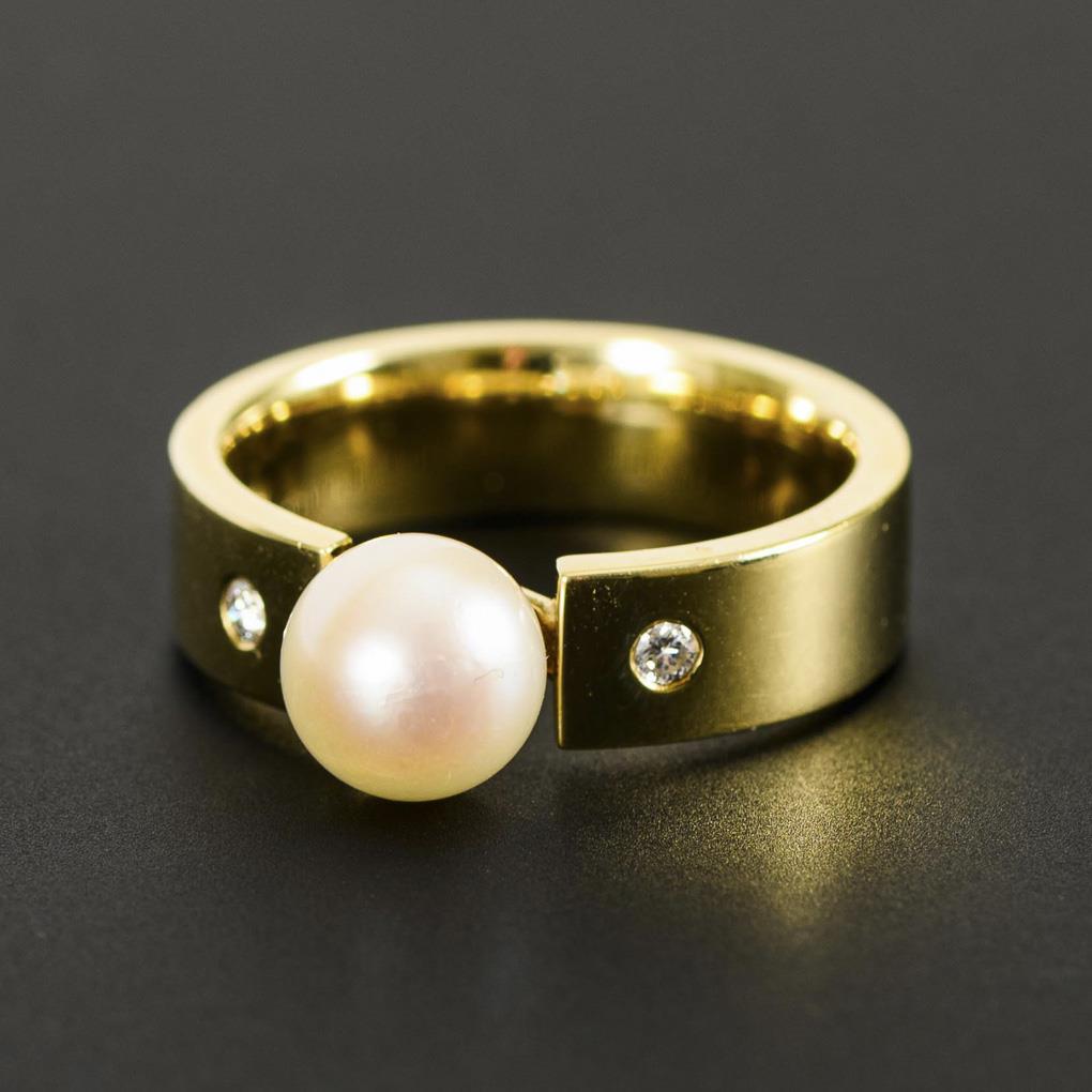 Gelbgold 585 gestempelt. Perle Ø 7,5 mm. Brillanten zus. ca. 0,06 ct/Weiß/si/PI. Ringgröße 54. 7,9 g.