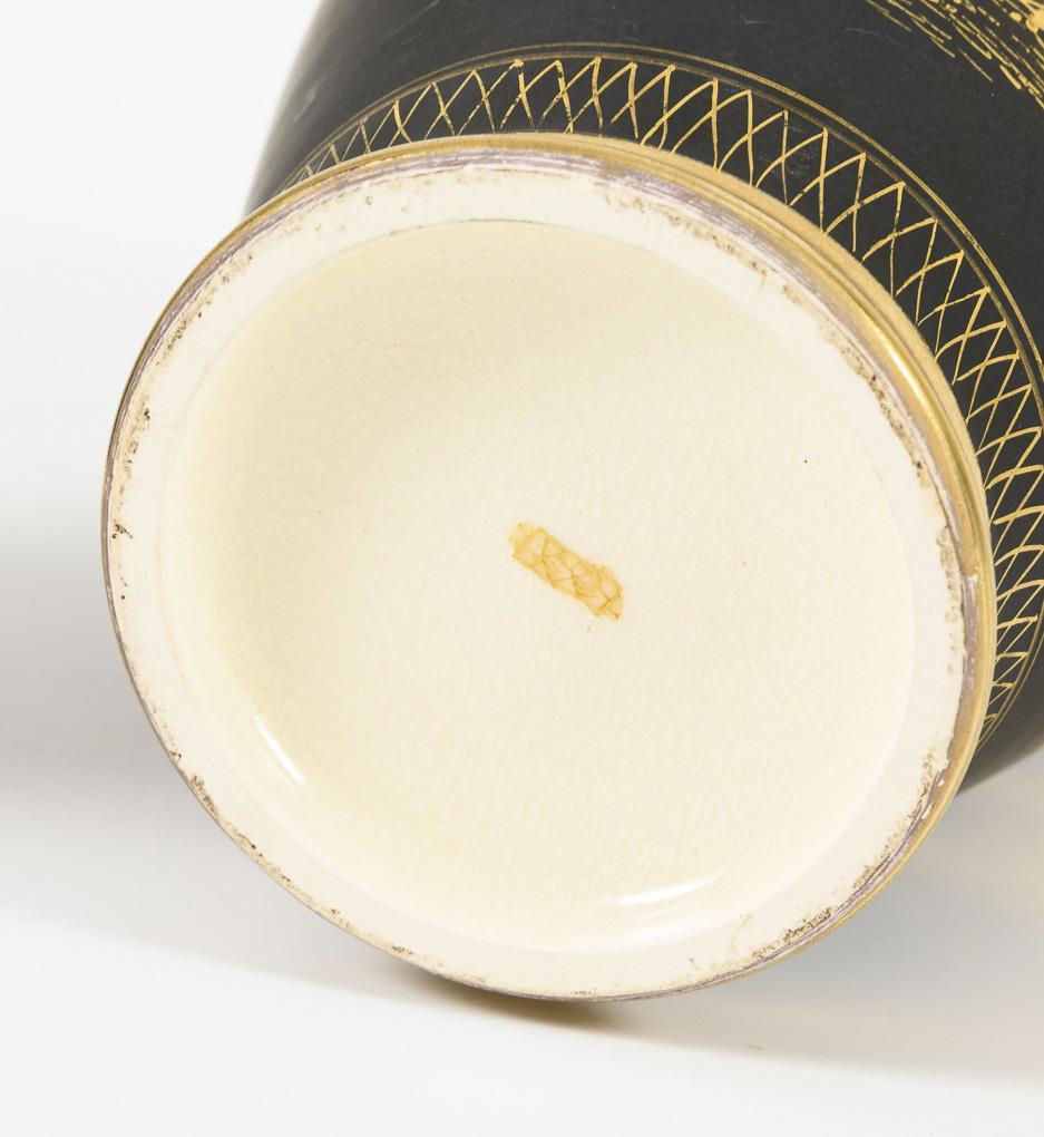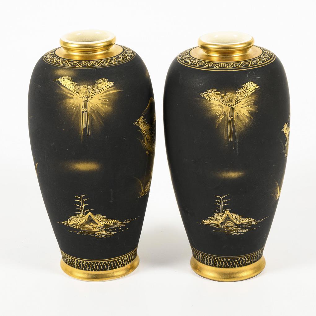 In der Art der Satsumaware. Balustervasen mit feiner Goldmalerei auf mattschwarzem Grund. Stilisierte Landschaft mit Pagode vor Fuji. Helle Glasur am Boden krakeliert. Minimale Gebrauchsspuren.
