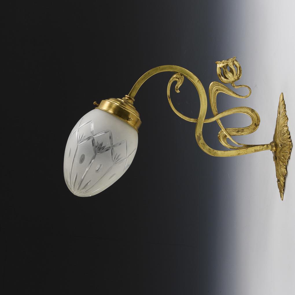 Elegante 1-flammige Wandlampe mit stiltypisch floral gestaltetem Arm an rautenförmiger Wandhalterung; zapfenförmiges satiniertes Pressglas mit Kerbdekor. Metall mit Korrosionsspuren, Glasrand mit kleinen Chips.