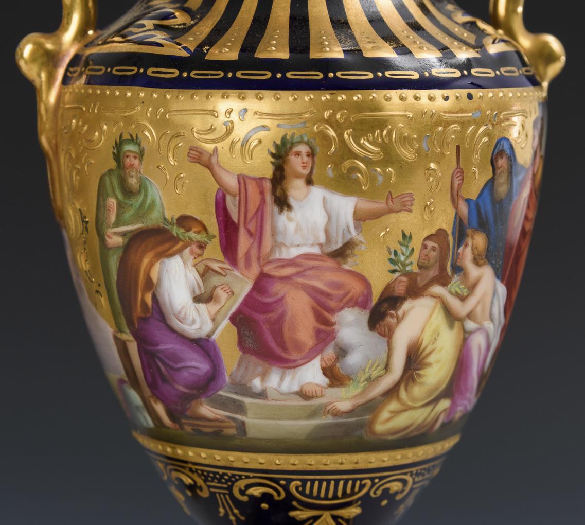 Halbovoider Korpus, eingezogener Hals, zwei geschwungene Henkel, Rundfuß; auf Quadratplinthe und Quadratsockel. Kobaltfond mit reicher ornamentaler, teils reliefierter Goldmalerei; auf der Wandung fein gemalte, unterseitig undeutlich bezeichnete mythologische Szenen vor Goldfond. 1x am Korpusansatz geklebt, minimaler Goldabrieb bzw. partiell kleine Fehlstellen am Reliefgold.