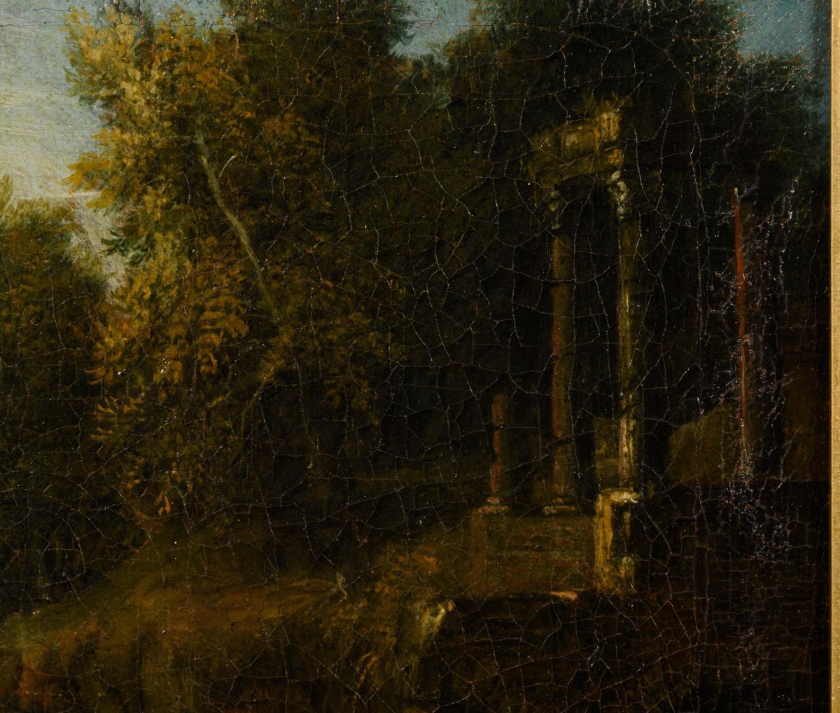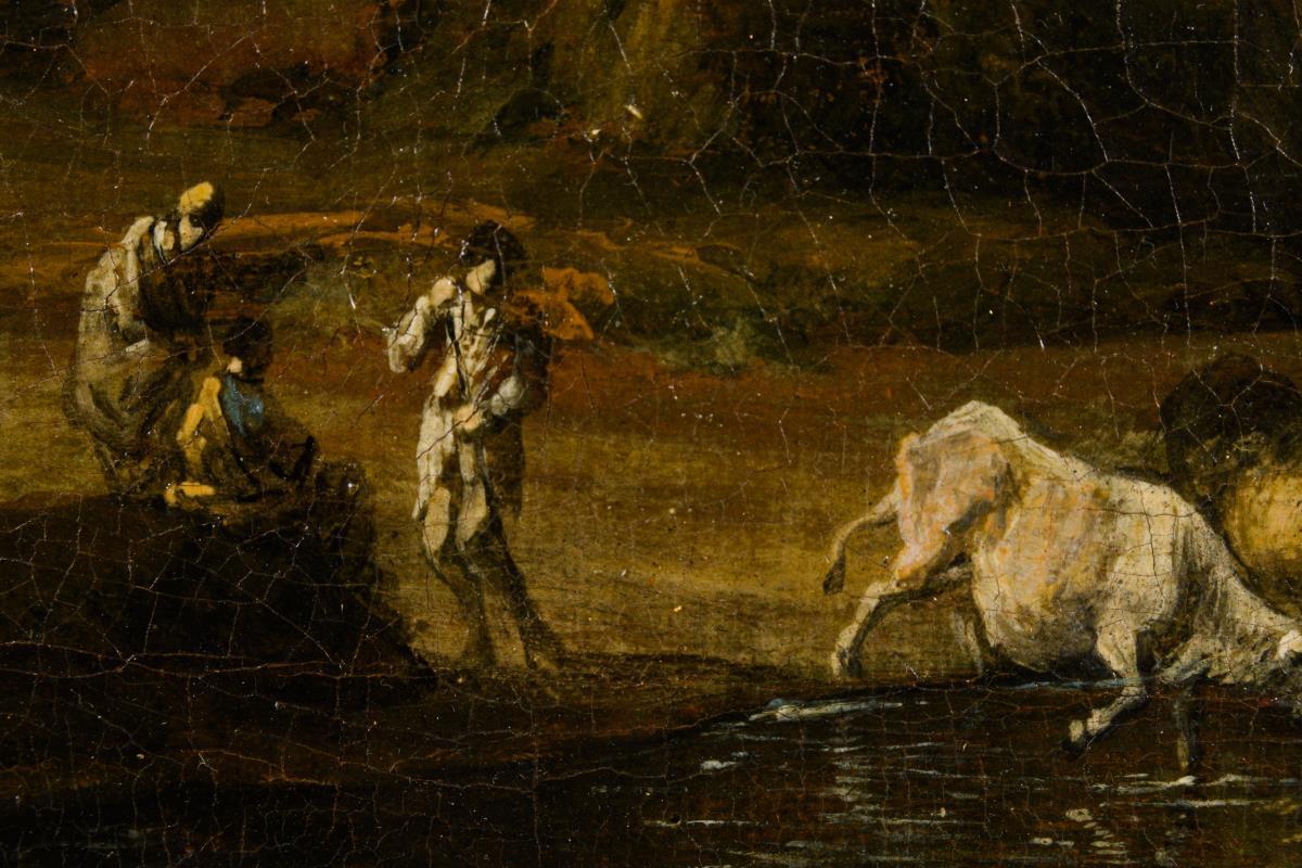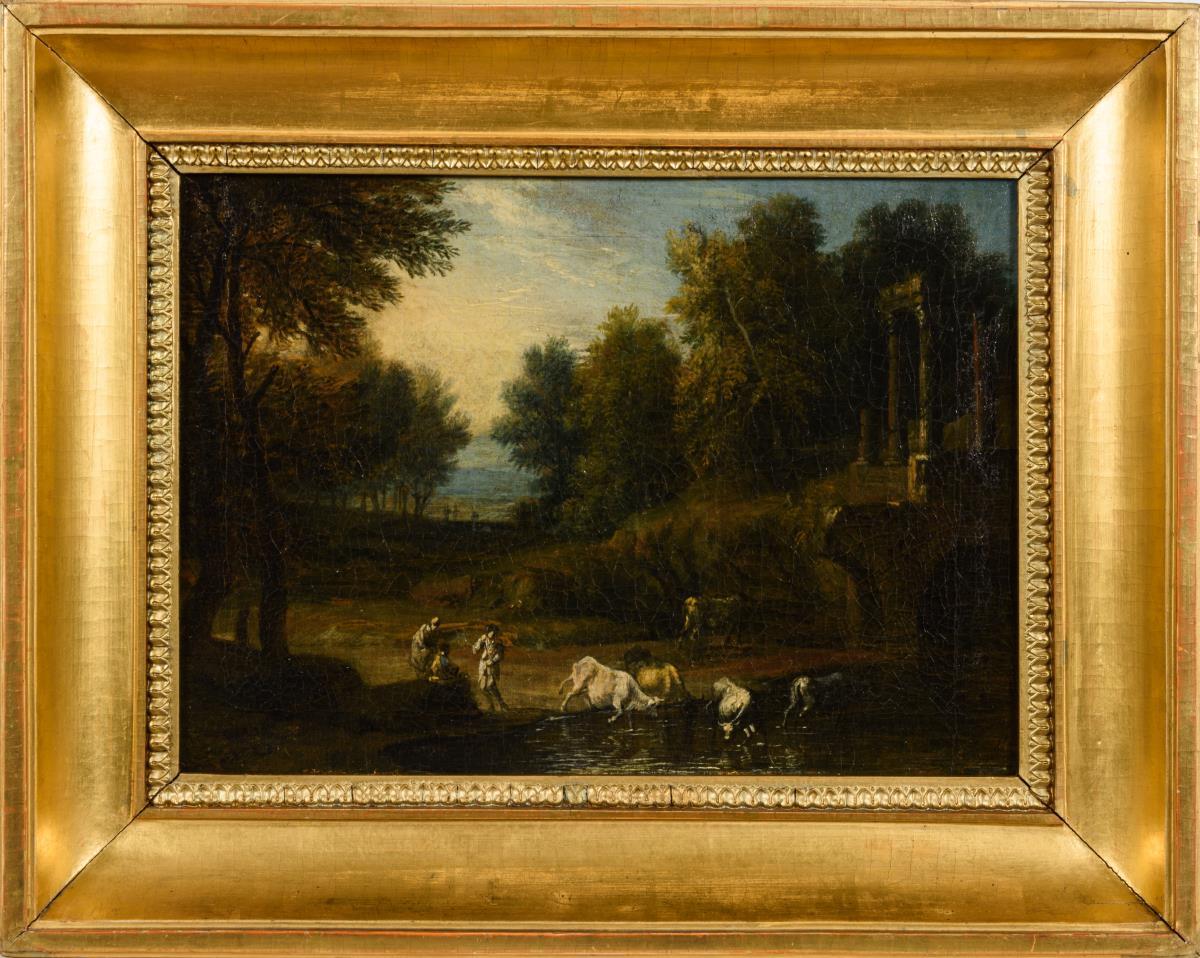 Einige Hirten mit Rindern am Ufer des Sees mit Ruinen im Wald sowie Ausblick in die Ferne. Einige Altersspuren, gering retuschiert, doubliert.