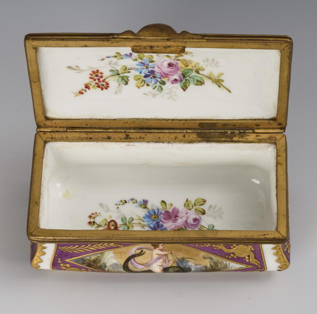 Rechteckiger, gedrückter Korpus mit metallmontiertem Scharnierdeckel. Purpurfarbener Fond, allseitig rautenförmige Kartuschen, darin 1x eine Bacchantenszene mit Ziegenbock und 1x ein auf einem Delfin reitender Putto, in den Zwickeln feine Goldreliefmalerei.
