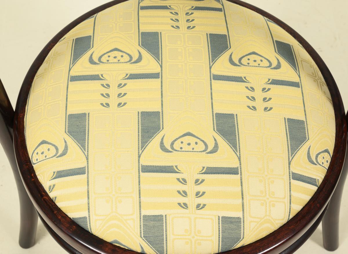 Armlehnstuhl im Design-Jugendstil mit runder, gepolsterter Sitzfläche, weit gebogtem Schulterbrett und senkrecht versprosster Rückenlehne; heller Bezug mit stiltypischen Ornamenten. Wohnfertig restauriert.