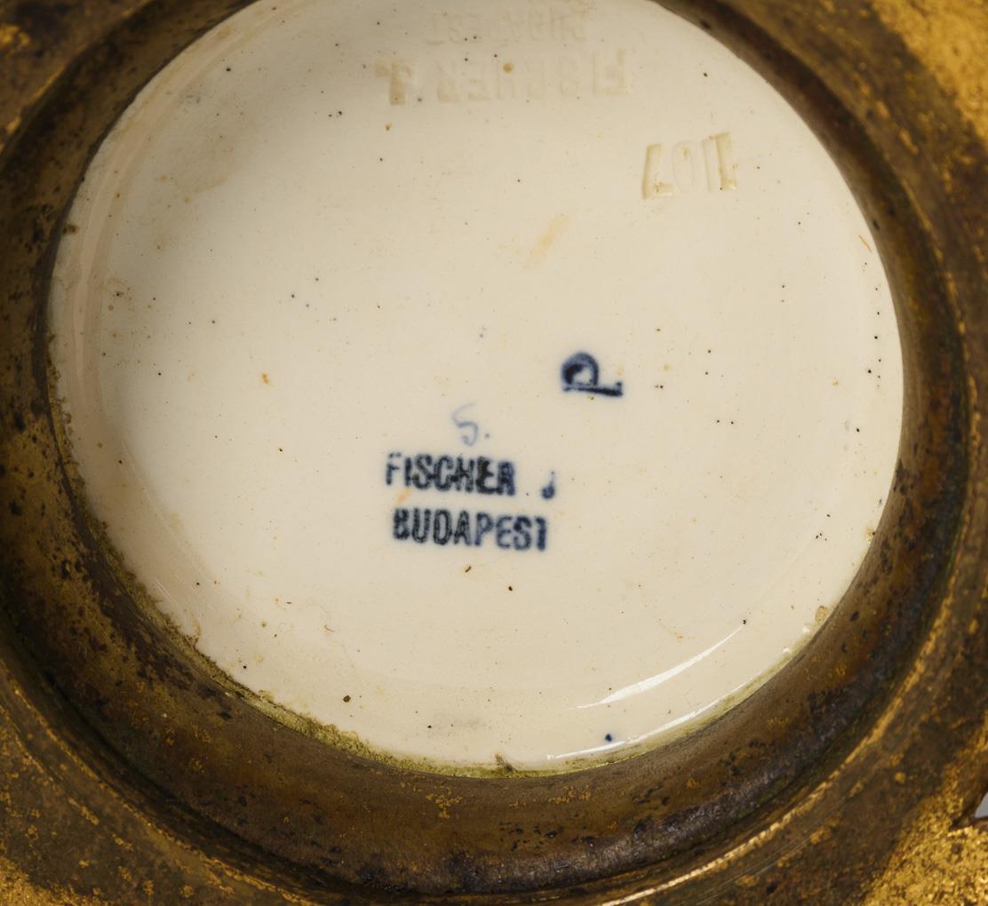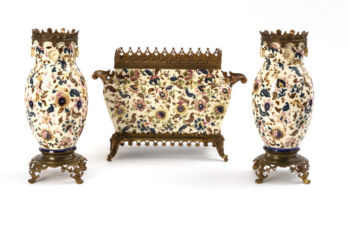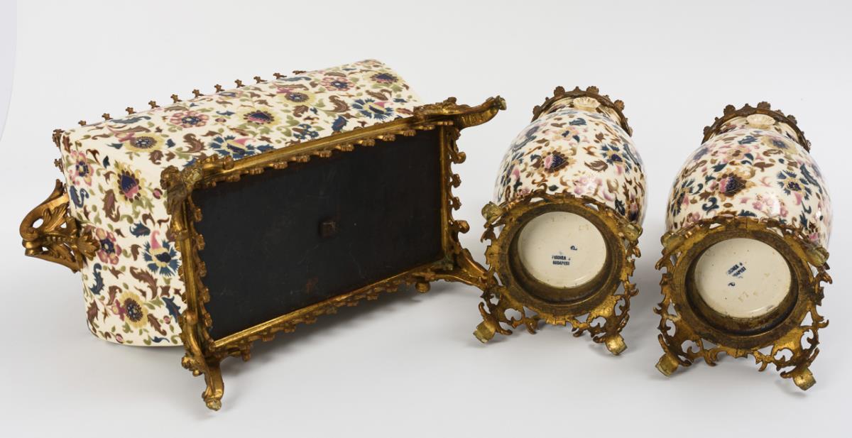 3-teilige Gründerzeit-Vasengarnitur mit Bronzemontierung. Ignác Fischer, Budapest.