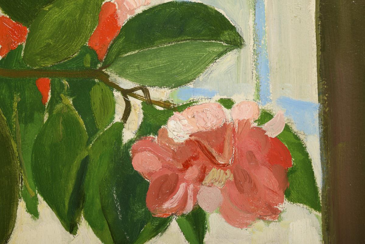 Blühende Topfpflanze auf dem Fenstersims im hellen Licht.