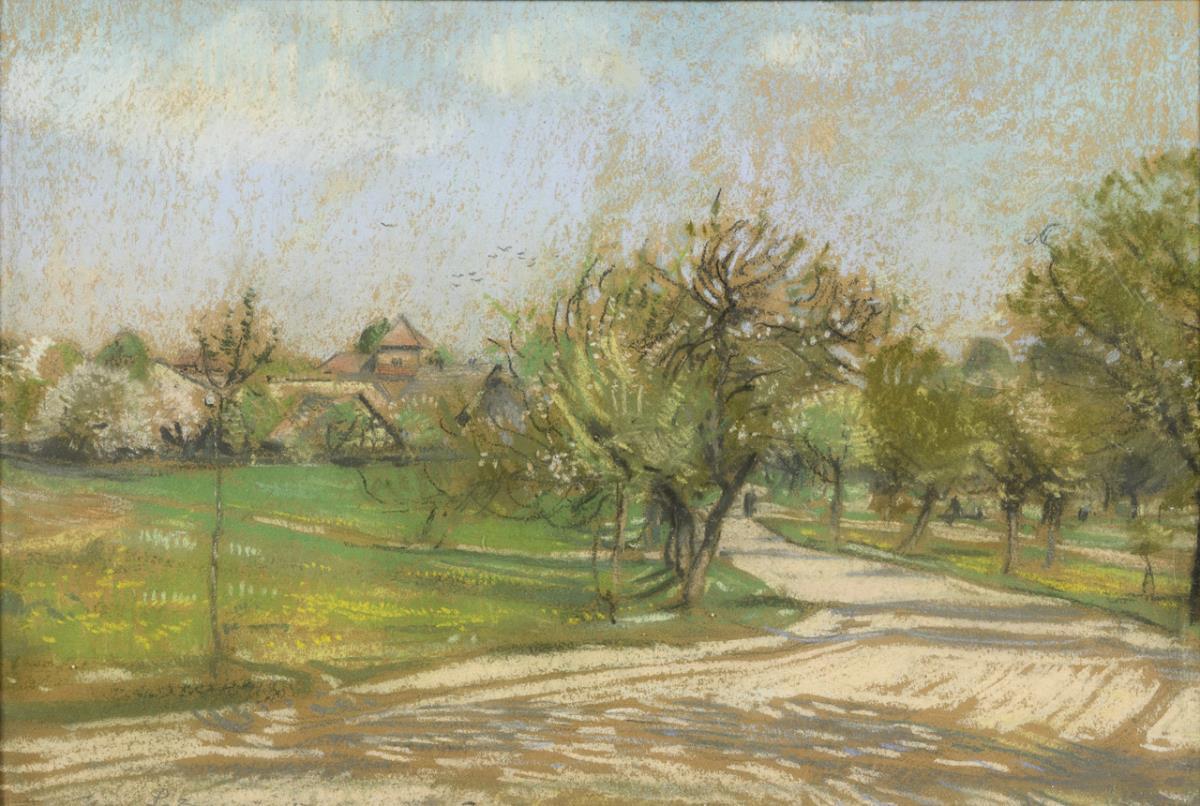 Kleine Allee mit blühenden Obstbäumen vor einer Ortschaft unter blauem Himmel.