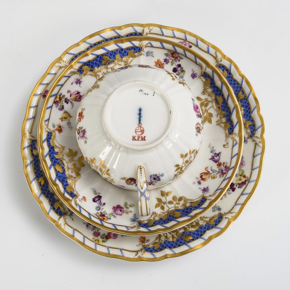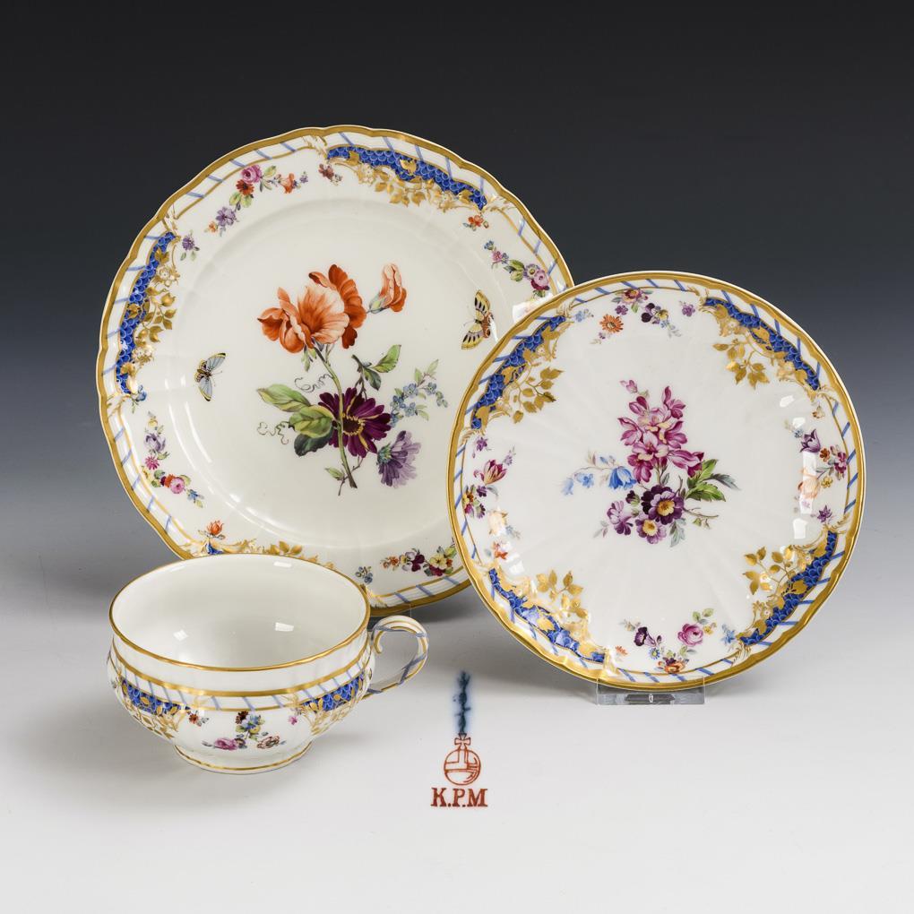 Polychrome Blumenmalerei, blaue Schuppenreserven und Goldstaffage. Teetasse (H 5,5 cm), Untertasse (Ø 16 cm), Teller (Ø 19,5 cm).
