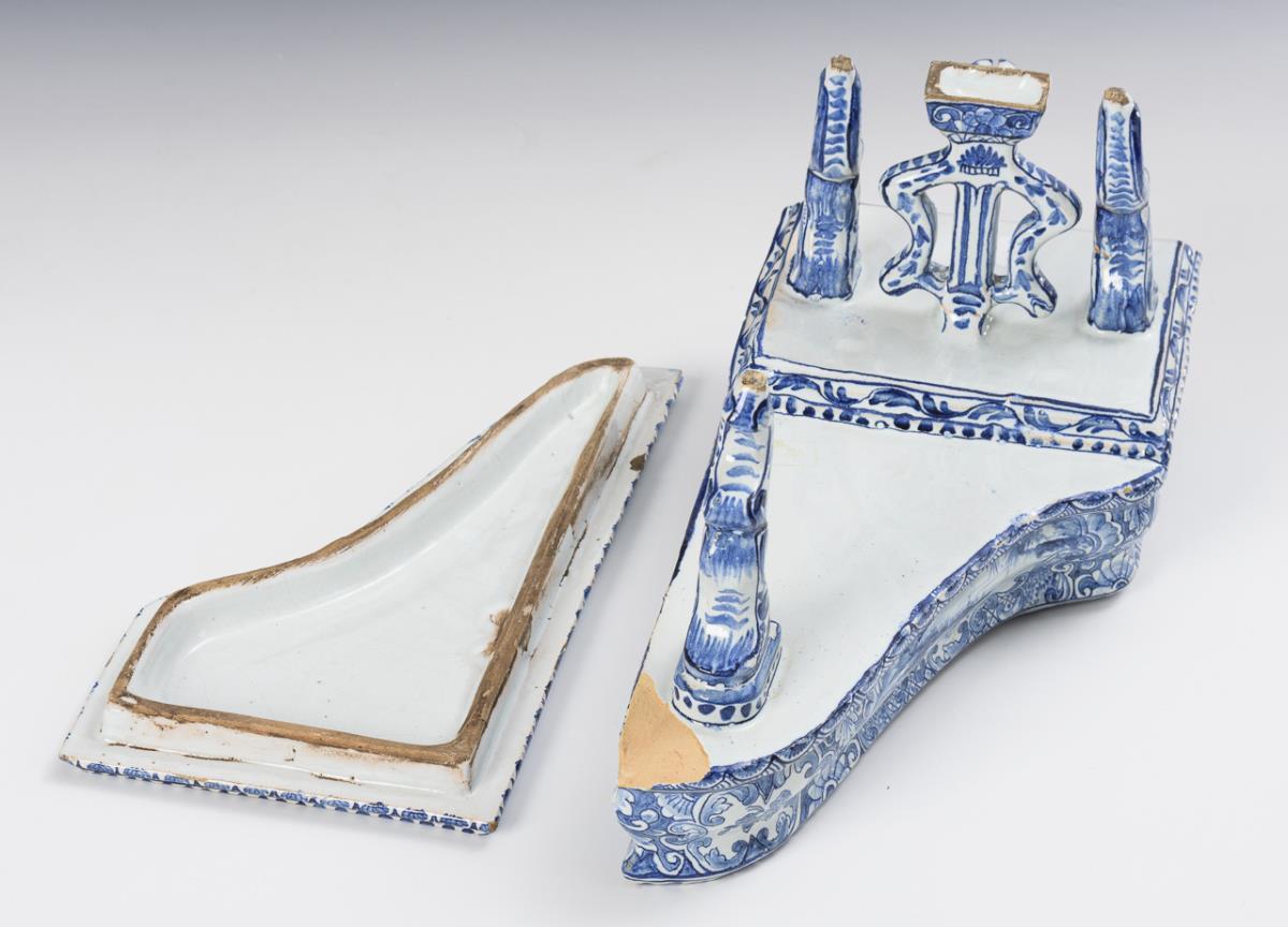 Leicht kleisterblau glasiert, Bemalung in Kobaltblau. H 15,5 cm, L 28,5 cm.