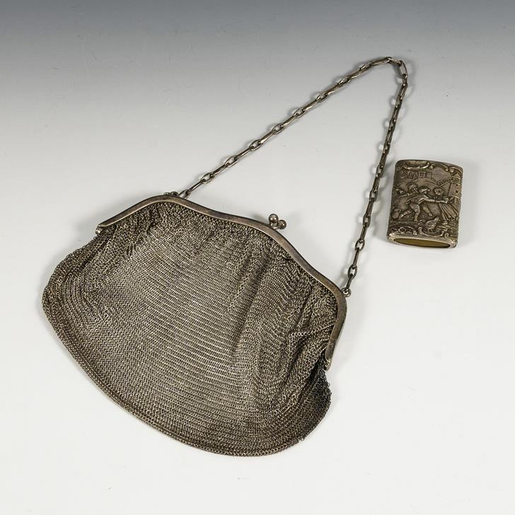 Elegantes Täschchen an kurzer Kette. Bügellänge 16,5 cm. Dazu kleines Zündholz-Etui mit reliefierten Figurenszenen, 6 x 4 x 1 cm. Minimale Gebrauchsspuren.