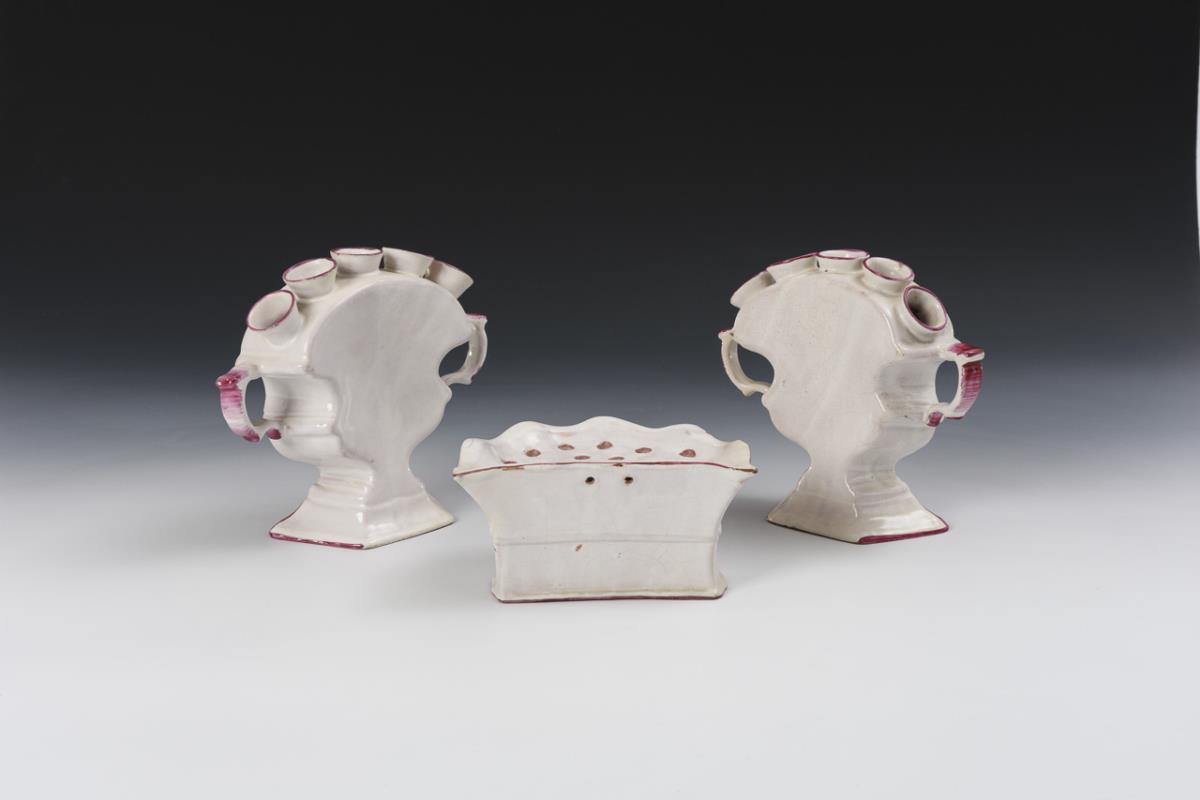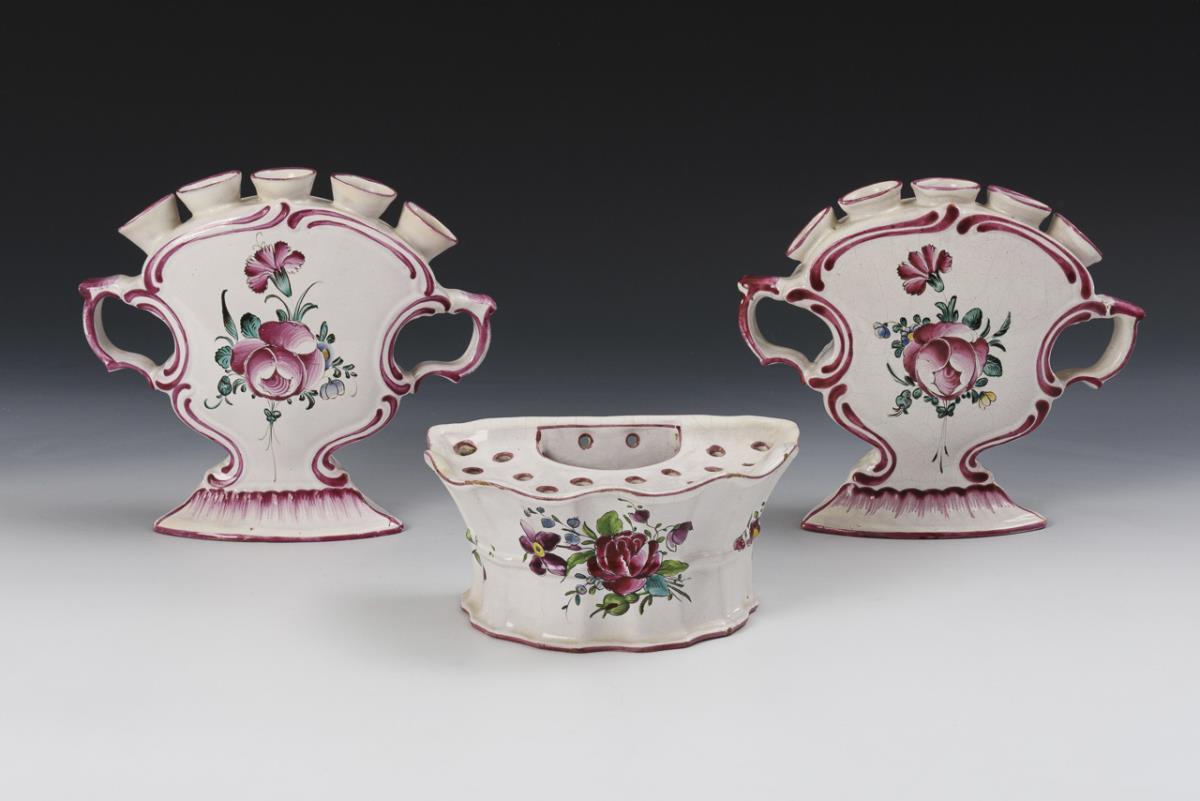 Fünftüllige Steckvasen mit geplatteter und rocaillierter Wandung, seitlichen Handhaben und abgesetztem Stand (H 17 cm). Wandgefäß als Steckvase mit geschweiftem Korpus und kleinen Stecklöchern (H 8 cm). Partiell leicht bestoßen und glasurrissig, restauriert.