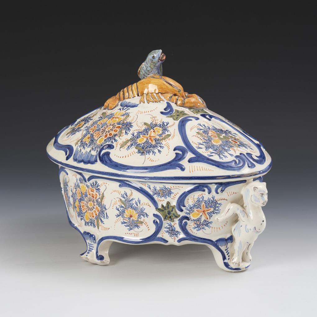 Ovale Reliefschale mit seitlichen Tierplastiken, auf 4 Muschelfüßen. Deckel mit plastischem Knauf als Fisch und Hummer.