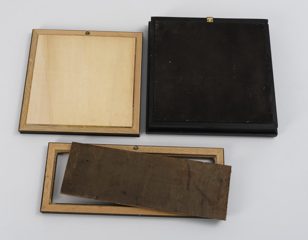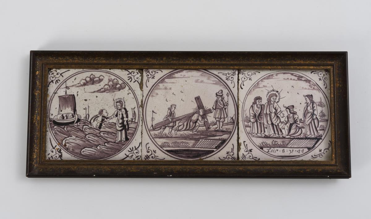 Querformat mit 3 Fliesen, darauf Szenen Christi in Manganviolett (17 x 43,5 cm). Bildquadrat mit 4 verschiedenen Fliesen, jeweils mit Stadtarchitektur und Booten an Gewässern (30,5 x 30,5 cm). 4-teiliges Fliesenbild mit einem prächtigen Blumenbukett und Vögeln (33,5 x 33,5 cm). Jeweils mit Holzrahmen. Mit Defekten und Altersspuren.