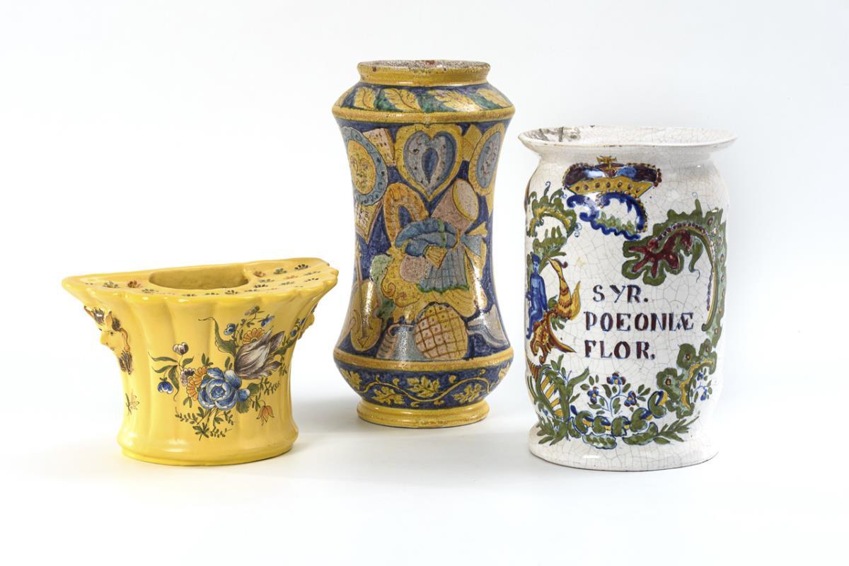 Konkaves Majolika-Zylindergefäß mit Darstellung des Heiligen Sebastian, rückseitig verschiedene Instrumente und Symboliken (H 31 cm). Weißes Fayence-Apothekergefäß mit gemalter Krone und Rankenwerk mit exotischer Figur und Vogel, bez. "syr poeoniae flor." (H 26 cm). Gelb glasierte Steckvase mit gerippter Wandung, Stecklöchern und seitlichen Maskaronen, farbige Blumenmalerei (H 14,5 cm). Alters- und Gebrauchsspuren, teils mit Defekten, Steckvase restauriert und bodenseitig mit Ausbruch.