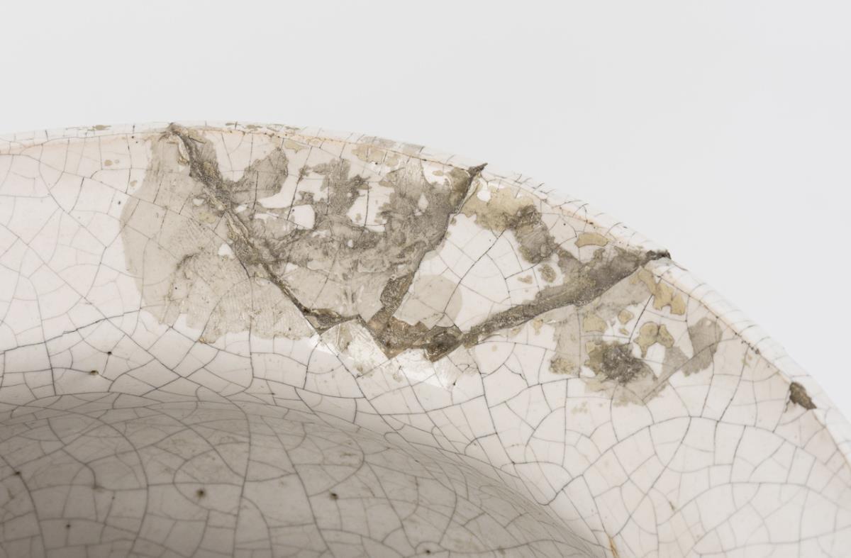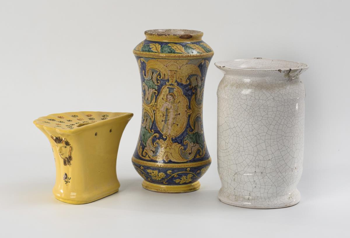 Konkaves Majolika-Zylindergefäß mit Darstellung des Heiligen Sebastian, rückseitig verschiedene Instrumente und Symboliken (H 31 cm). Weißes Fayence-Apothekergefäß mit gemalter Krone und Rankenwerk mit exotischer Figur und Vogel, bez. "syr poeoniae flor." (H 26 cm). Gelb glasierte Steckvase mit gerippter Wandung, Stecklöchern und seitlichen Maskaronen, farbige Blumenmalerei (H 14,5 cm). Alters- und Gebrauchsspuren, teils mit Defekten, Steckvase restauriert und bodenseitig mit Ausbruch.