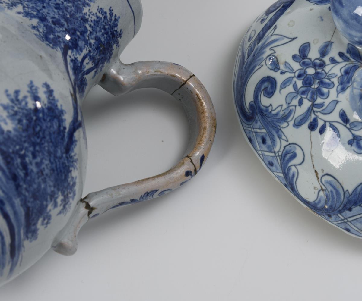 3 Delfter Fayencen mit Blaumalerei: Schlangenhenkelvase, Krüglein und Dose.