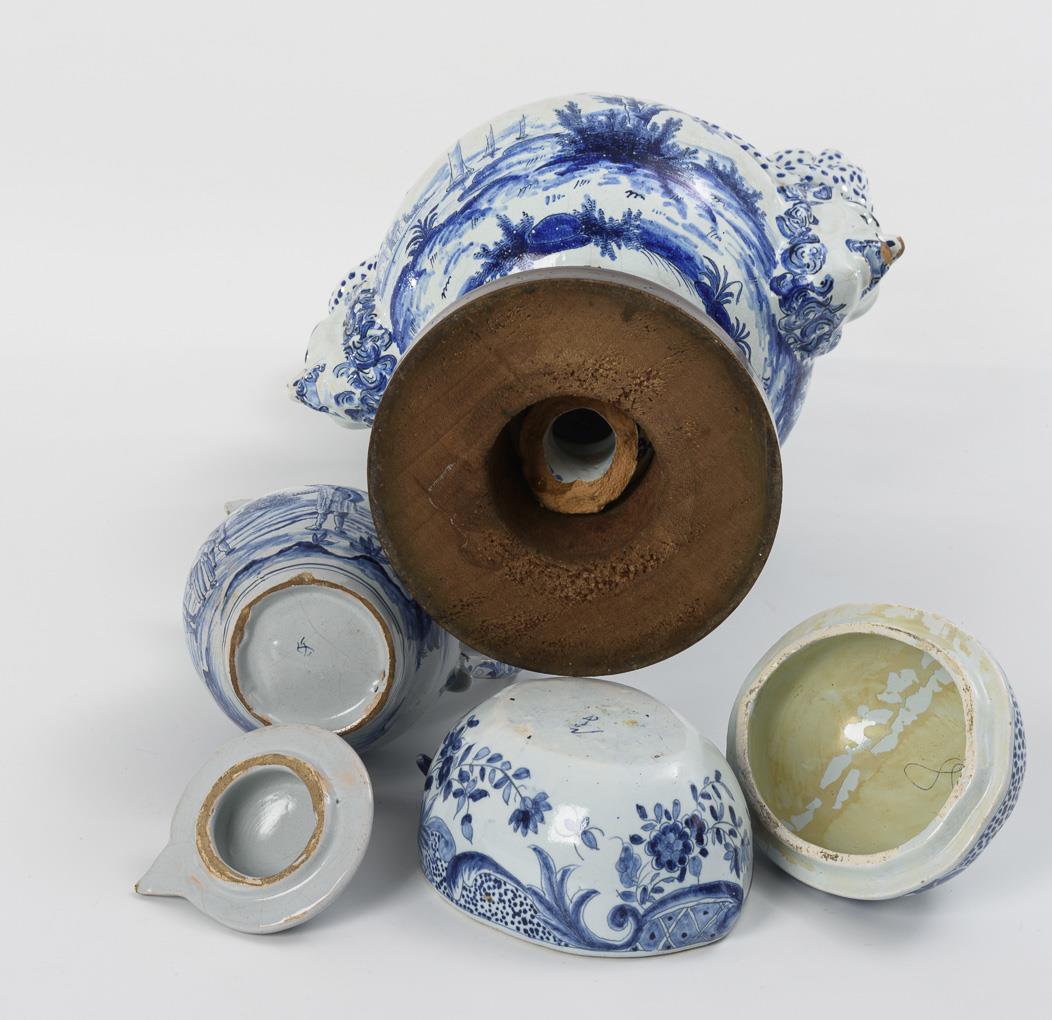 Kugelbauchvase mit aufwendig gedrehten Schlangenhenkeln und Maskaronen, auf ergänztem Holzsockel, Bemalung mit Landschaften, Figuren und Booten (H 36,5 cm). Kännchen mit Ohrenhenkel und spitzer Schneppe, Deckel mit Zapfenknauf, Bauern in Landschaft (H 15,5 cm). Dose in Fruchtform, Deckel mit Knospenknauf (H 10,5 cm). Jeweils mit Defekten und Reparaturen.
