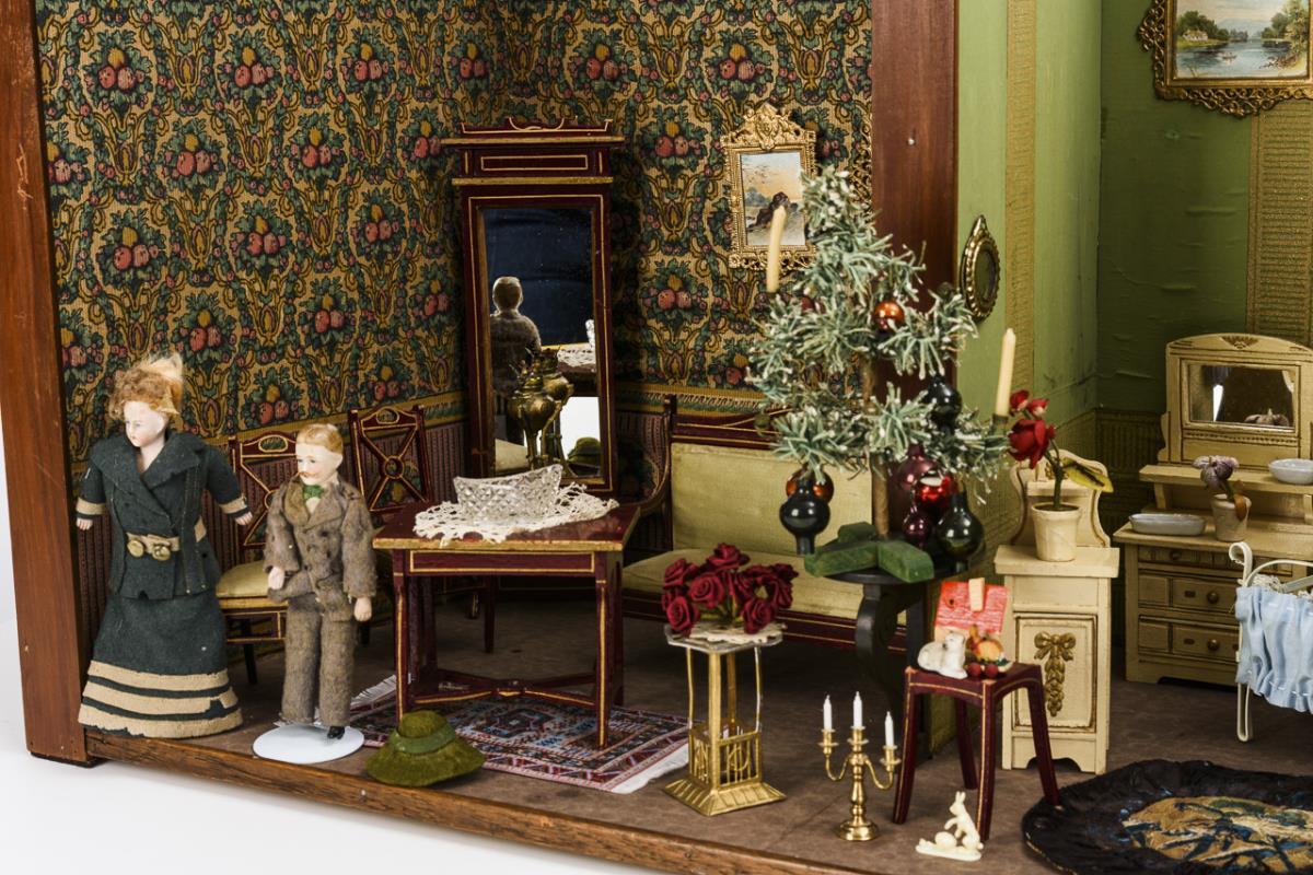 Trapezförmiges Gehäuse, mit Wohnstube als Salon mit mahagonifarbenen Möbeln und Weihnachtsbäumchen und Schlafzimmer mit weißen Möbeln im Stil der 1920er/30er Jahre eingerichtet. Dazu 3 defekte Puppenstuben-Püppchen: Original bekleideter Herr mit Schnurrbart, Dame in altem Matrosenkleid und Ganzbiskuit-Püppchen. Altersspuren und Defekte. Püppchen mit starken Defekten: Arme, Beine, Füße teils fehlend.