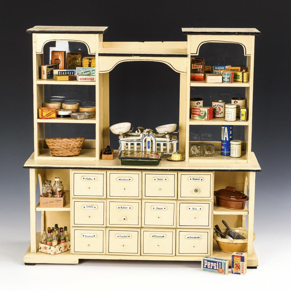 Großer Ladenschrank mit 2 Auslagen, 12 beschrifteten Schüben und offenen Fächern. Dazu Waage, Dosen, Pappschachteln etc. Leichte Altersspuren, Schubladenknäufe fehlend.
