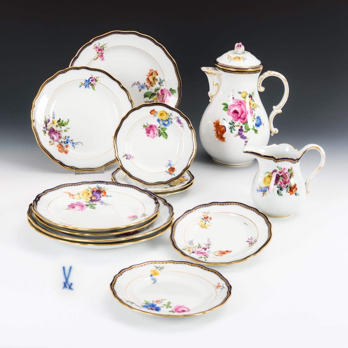 Form "Neuer Ausschnitt". Kobaltrand mit Goldspitzenbordüre, Blumenmalerei. Kaffeekanne (H 25 cm), Milchkännchen, 3 Dessertteller (Ø 16 cm), 2 Kuchenteller (Ø 17 und 18 cm), 3 Salatteller (Ø 21,5 cm) und 3 Speiseteller (Ø 25 cm). Rosenknauf der Kaffeekanne etwas restauriert.