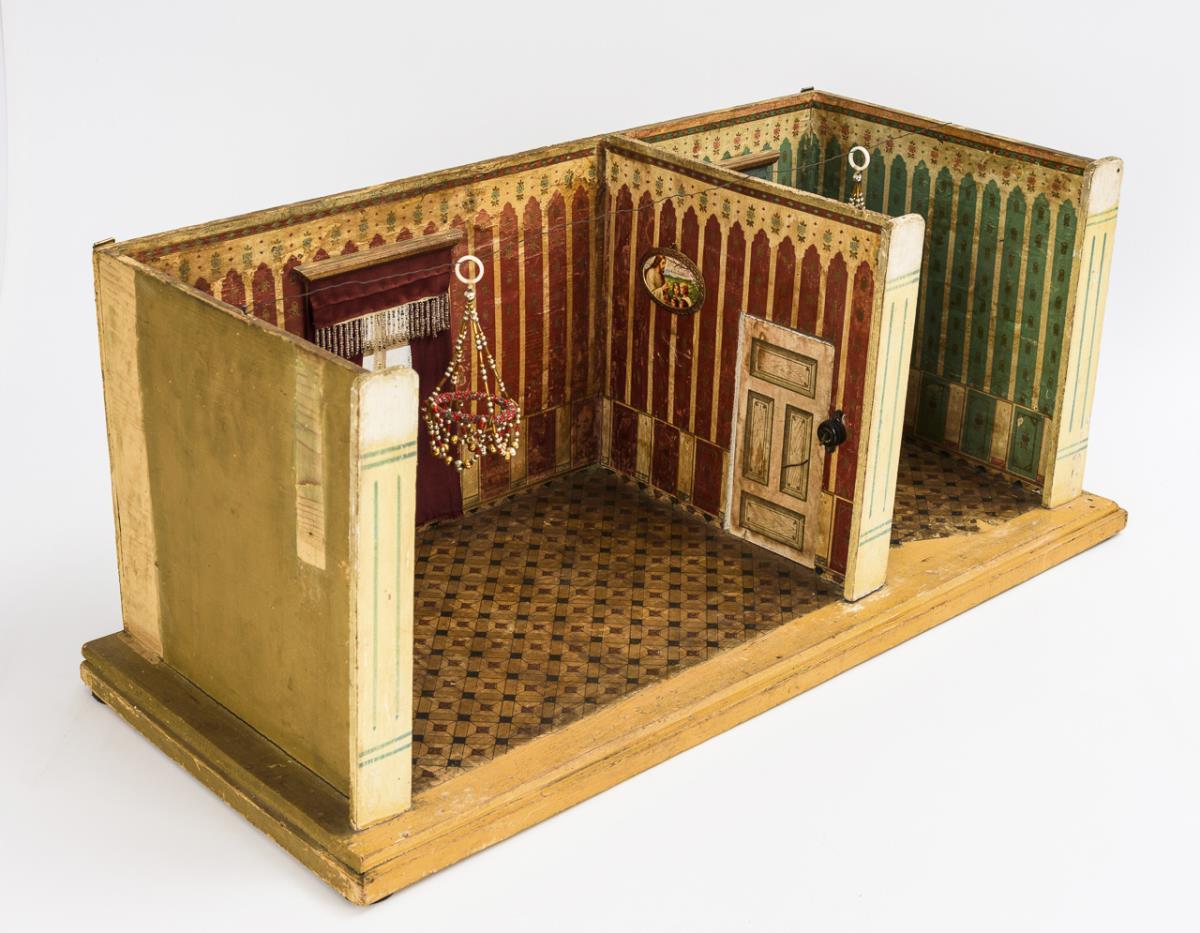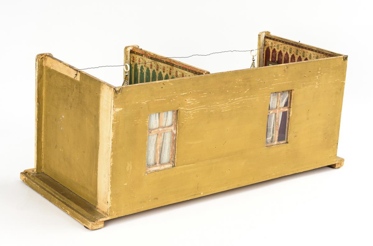 Holz, außen olivgrün und cremefarben gestrichen, innen mit rot- bzw. grün-gestreifter Tapete und Fußbodenpapier tapeziert. 28 x 68 x 30 cm.