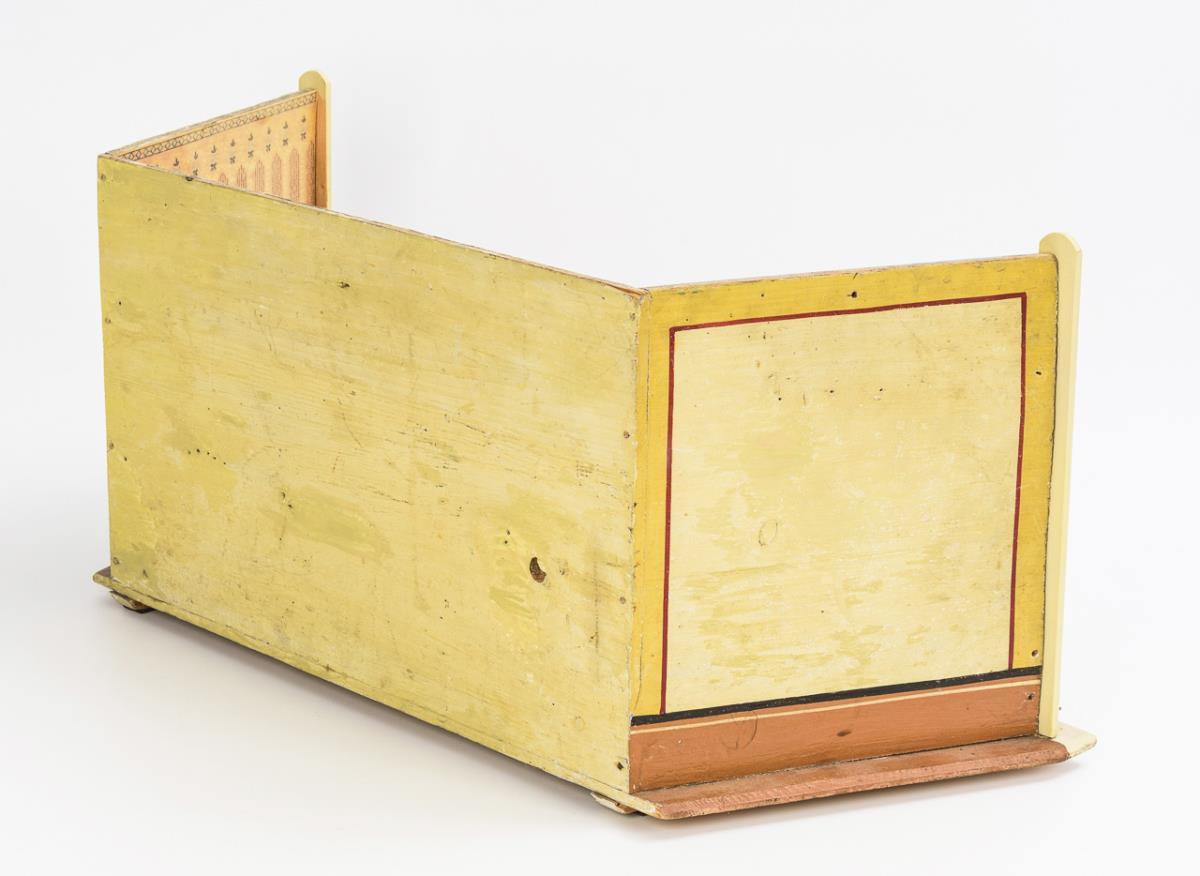 Holz, außen cremefarben gestrichen, innen mit gestreifter Tapete (wohl jünger) und Fußbodenpapier tapeziert. 29 x 66 x 26 cm.
