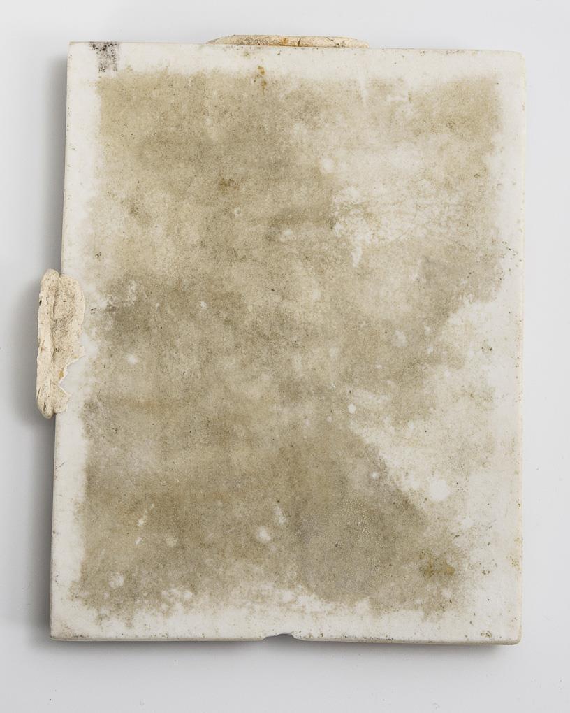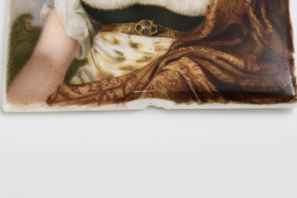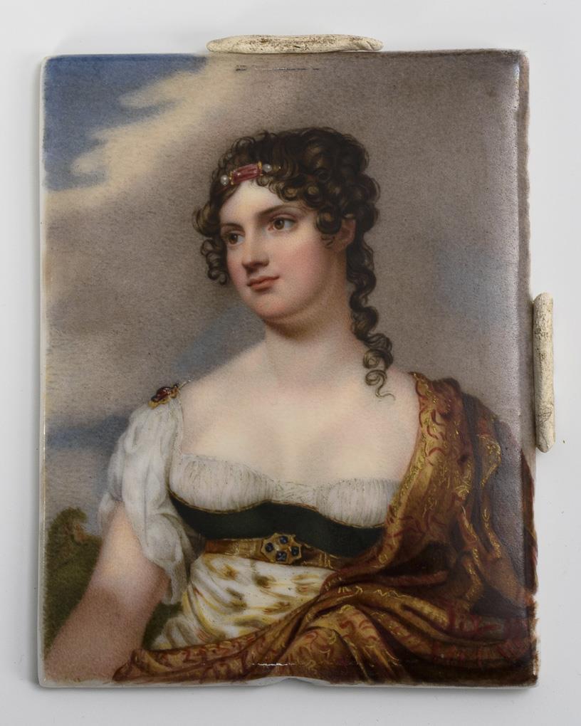Mit kleiner Staffelei als Aufsteller. Rechteckige kleine Bildplatte mit der Darstellung einer jungen Frau im Empire-Kleid mit Umhang. Bestoßung am unteren Bildrand.