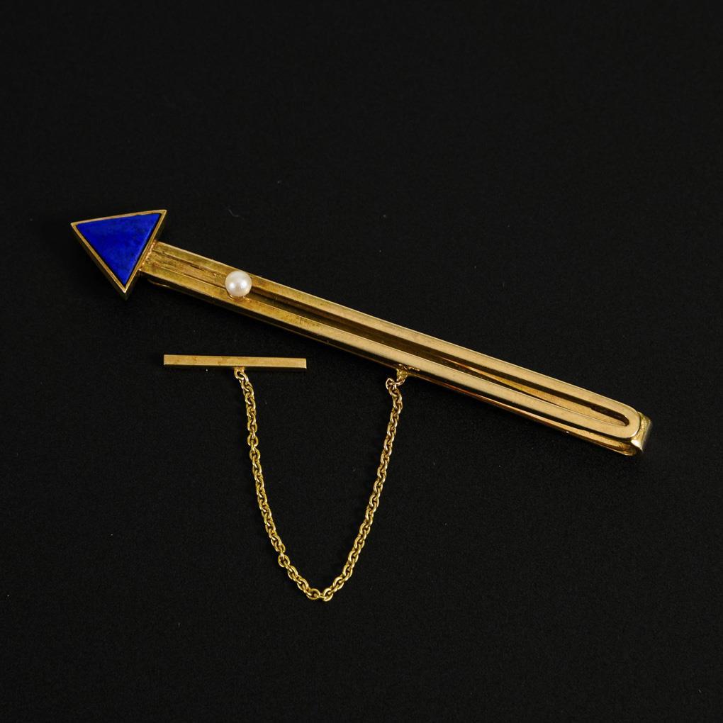 In Pfeilform handgearbeitete Klemme mit zargengefasstem Lapissegment und kleiner Zuchtperle. Sicherheitskette mit Knebelsteg. Passend zu Ring Kat.-Nr. 250.
