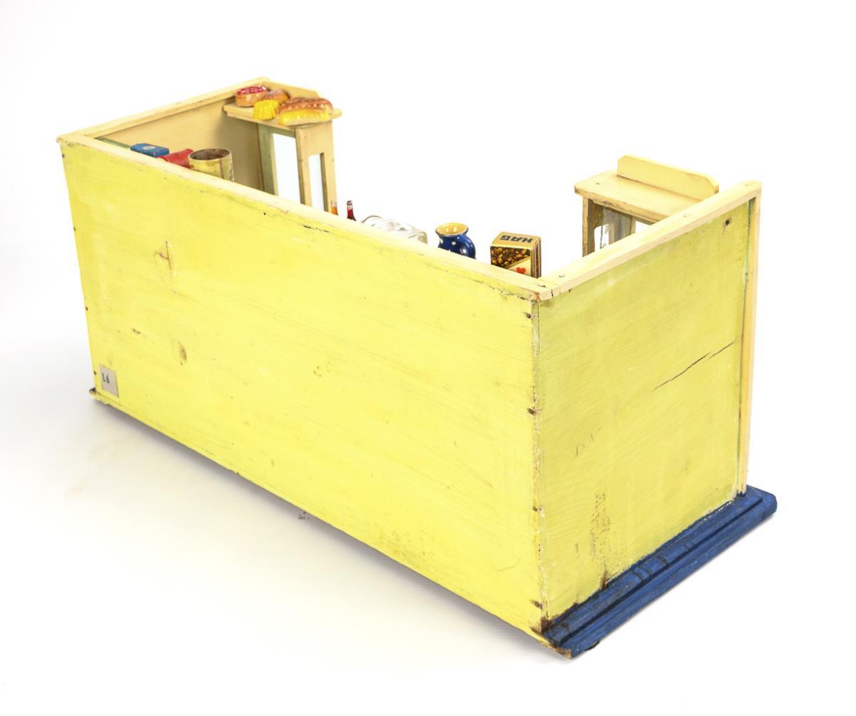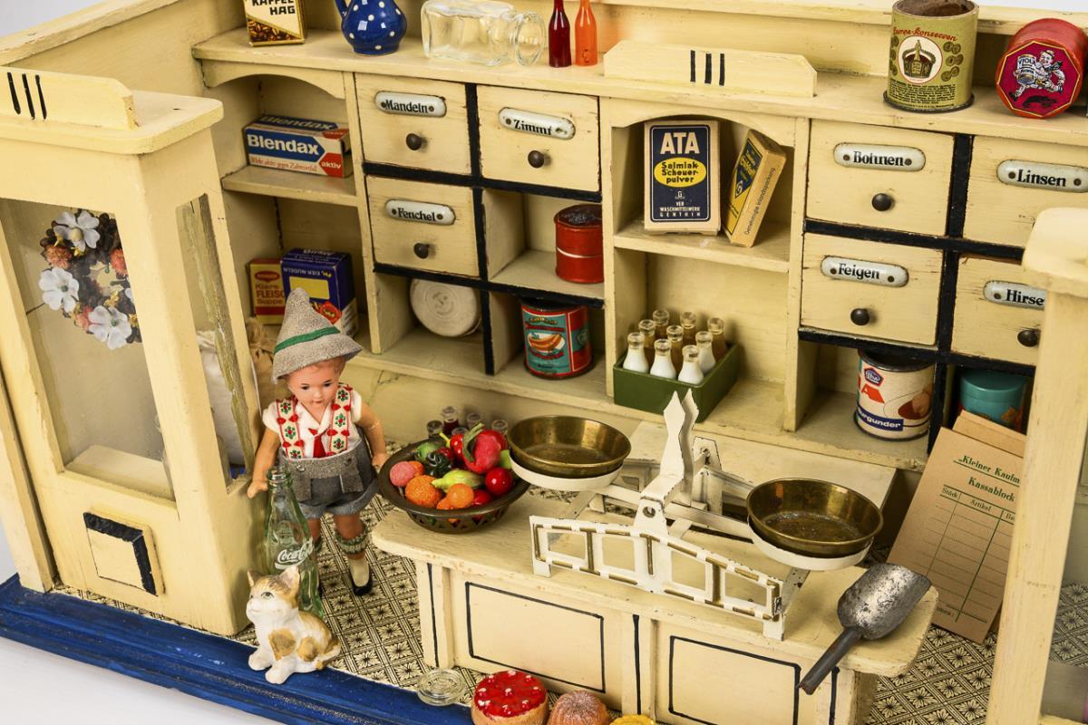 1-Raum-Gehäuse mit 2 verglasten Schaufenstern, festem Ladeneinbau mit 7 beschrifteten Schüben und lose eingestellter Theke. Ausgestattet mit Waage, Blechdosen, Pappschachteln, Backwaren, Getränkekisten etc. Dazu 1 Celluloid-Püppchen mit ergänzten Armen, in Tiroler Tracht (L 14,5 cm). Altersspuren, 1 Glasscheibe lose.