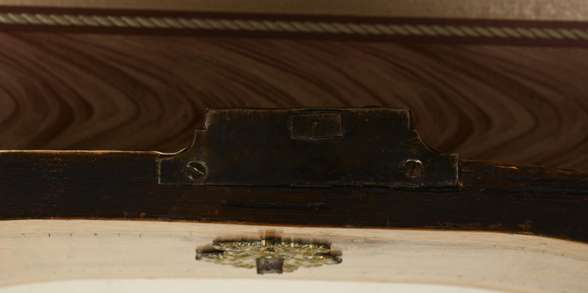 2-teiliger Aufsatzschrank mit 2-türigem Aufsatz mit gesprengtem Giebel und 3-schübigem Kommodenunterteil in stiltypisch geschwungener Form; verziert mit Maserfurnier und Blumenmarketerien, Rocaillen-Bronzebeschlägen mit Krone; innen mit gestreifter Tapete ausgekleidet, 3 Einlegeböden. Restauriert, Trockenrisse.