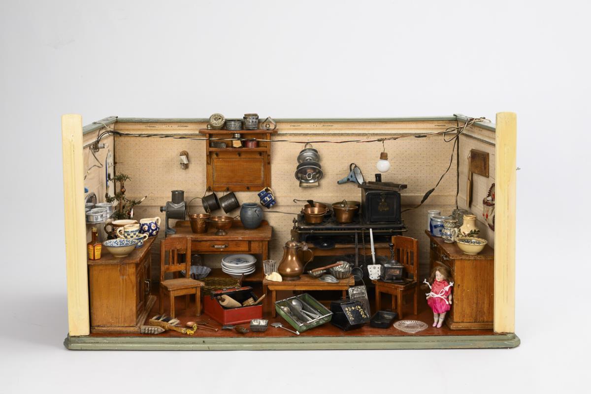 Leicht trapezförmiges 1-Raum Gehäuse mit 6 Holzmöbeln, seltenem Blechherd auf Holzgestell, Kupfergeschirr, sowie verschiedenem Zubehör aus Blech, Keramik, Holz, Porzellan etc. Dazu 1 Biskuitpüppchen mit defektem Beinansatz, L 11 cm. Gehäuse ursprünglich mit abnehmbaren Seitenteilen, diese jedoch (nachträglich) verschraubt.